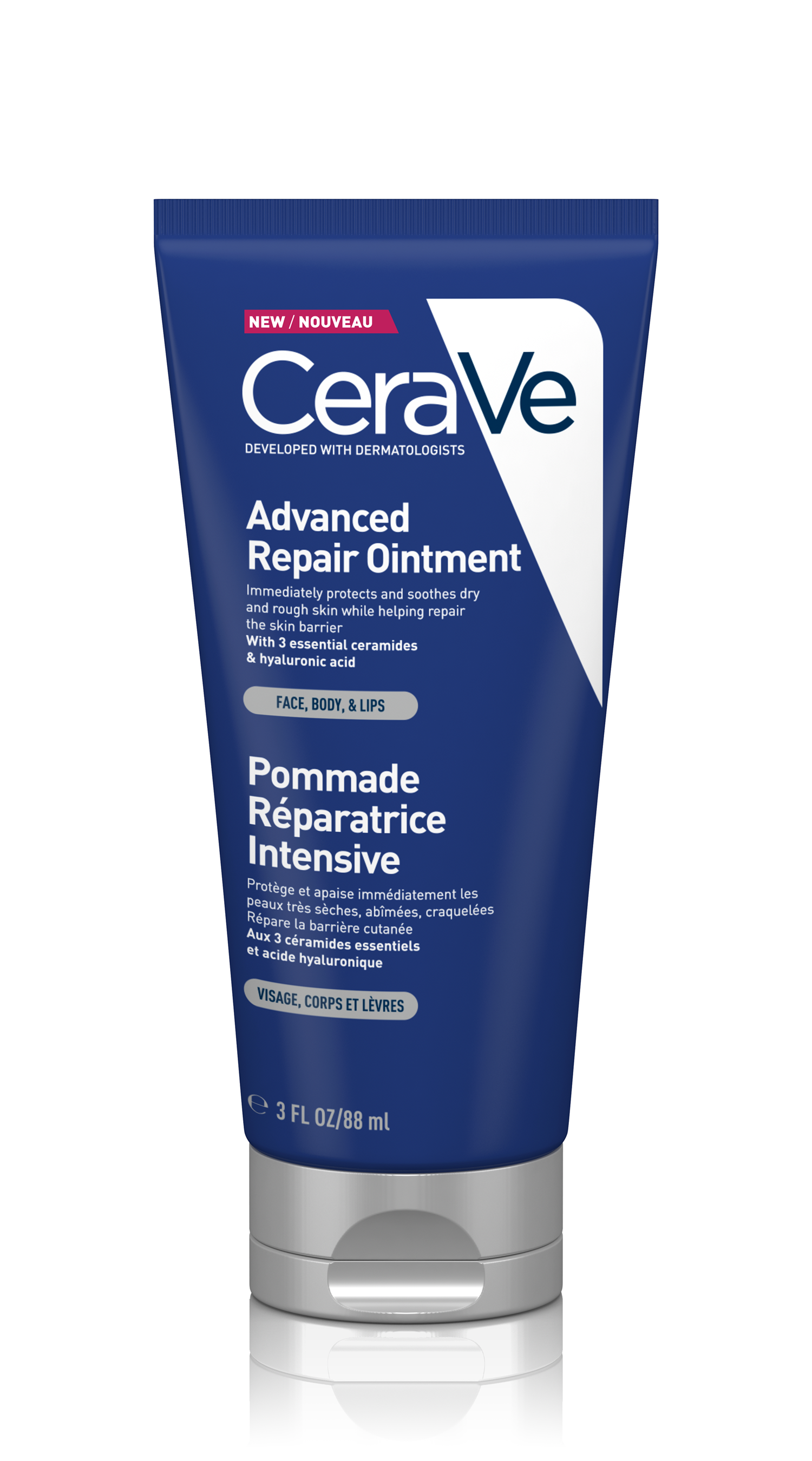Το νέο Advanced Repair Ointment περιέχει συστατικά που σχηματίζουν ένα προστατευτικό στρώμα στην επιφάνεια του δέρματος. Έτσι, «κλειδώνουν» την ενυδάτωση και συμβάλλουν στη μείωση της διαδερμικής απώλειας νερού, δηλαδή της εξάτμισης νερού από το δέρμα, η οποία οδηγεί σε ξηρότητα. Η πολύ αποτελεσματική αυτή σύνθεση περιέχει επίσης υαλουρονικό οξύ, καθώς και τα 3 απαραίτητα ceramides (1, 3, and 6-II) που υπάρχουν σε όλα τα προϊόντα της μάρκας, ώστε αφ’ ενός να προστατεύει αμέσως από την ξηρότητα και να καταπραΰνει το σκασμένο δέρμα και αφ’ ετέρου να συγκρατεί τη φυσική υγρασία και να επανορθώνει τον επιδερμιδικό φραγμό. Η σύνθεση δεν περιέχει άρωμα, χρωστικές και λανολίνη για να ελαχιστοποιήσει τον κίνδυνο τυχόν ερεθισμού που μπορεί να προκληθεί από αυτά τα συστατικά, κάτι που την καθιστά κατάλληλη για χείλη, χέρια, αγκώνες, πόδια, πρόσωπο, σώμα, όλους τους τύπους δέρματος και όλες τις ηλικίες, ακόμα και για βρέφη* μετά τον πρώτο μήνα ζωής.