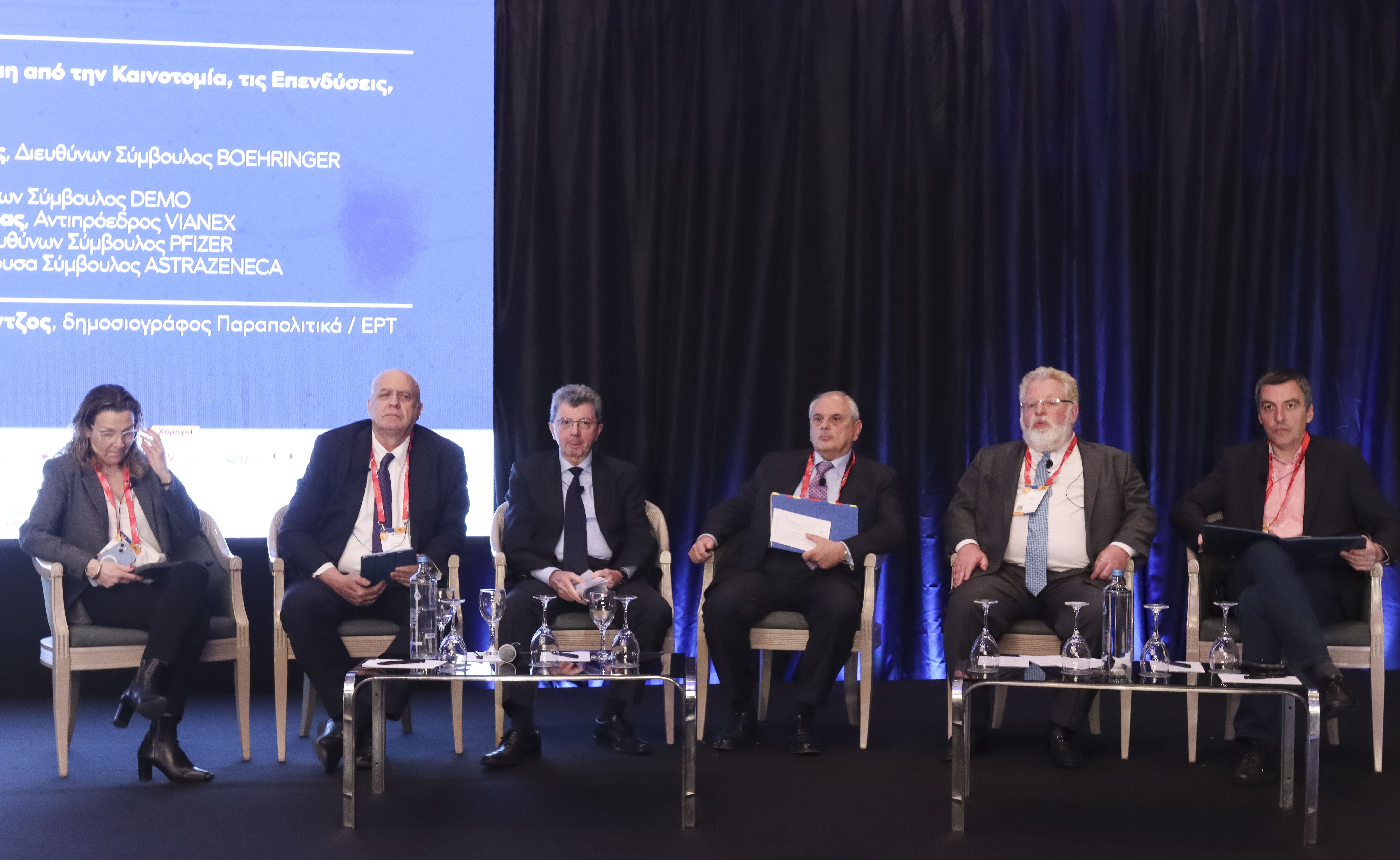 Συζήτηση με θέμα Κερδίζοντας σε Φήμη από την Καινοτομία, τις Επενδύσεις, την ΕΚΕ (διακρίνονται από αριστερά) Έλενα Χουλιάρα, Πρόεδρος & Διευθύνουσα Σύμβουλος ASTRAZENECA Ελλάδας και Κύπρου, Δημήτρης Αναγνωστάκης Διευθύνων Σύμβουλος ΒOEHRINGER INGELHEIM, Ζαχαρίας Ραγκούσης, Διευθύνων Σύμβουλος PFIZER, Κωνσταντίνος Παναγούλιας, Aντιπρόεδρος ΒΙΑΝΕΞ, Δημήτρης Δέμος Διευθύνων Σύμβουλος DEMO, Κώστας Παπαχλιμίντζος δημοσιογράφος Παραπολιτικά / ΕΡΤ