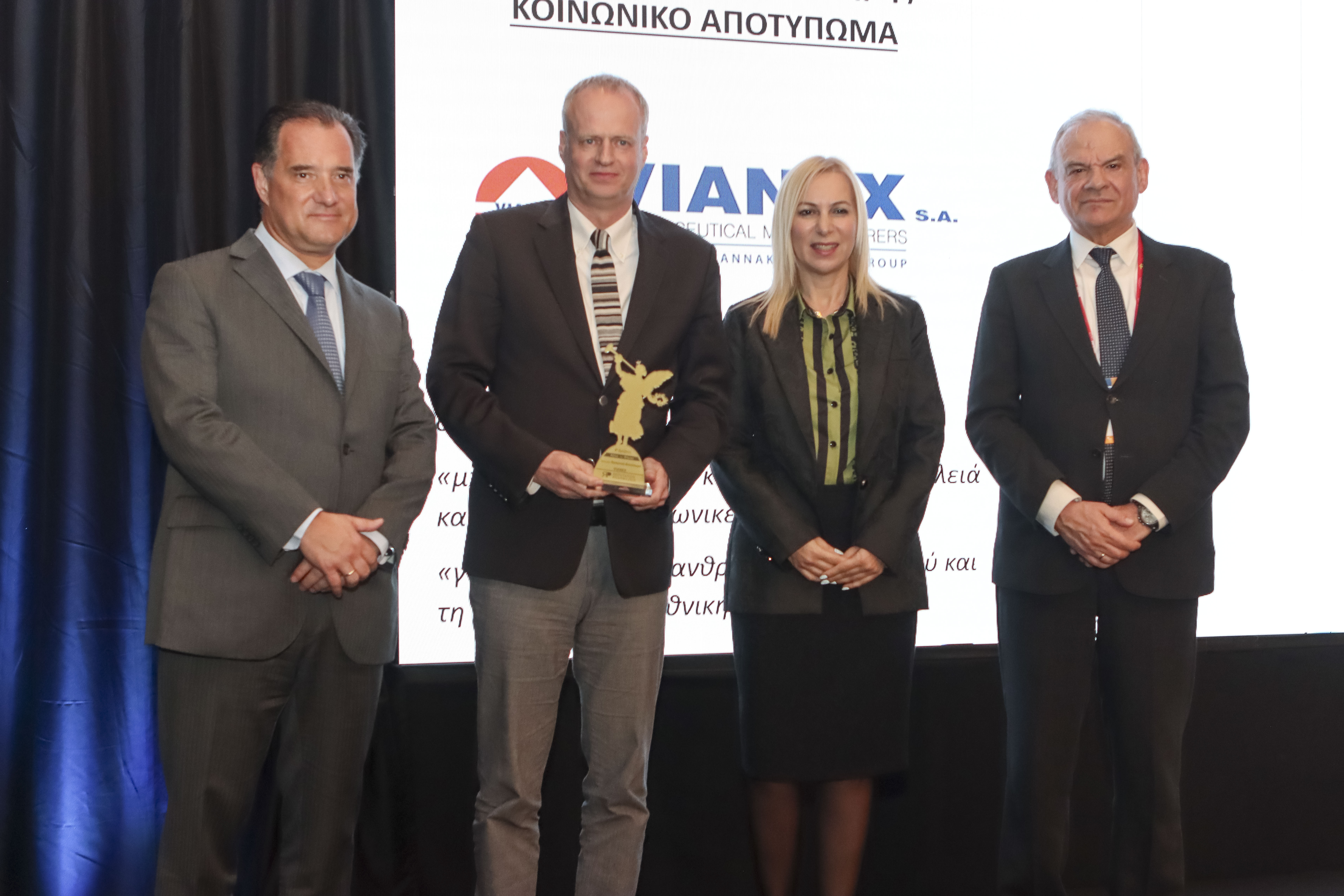 1ο βραβείο αξίας και φήμης για το Kοινωνικό Aποτύπωμα απονεμήθηκε στη ΒΙΑΝΕΞ (διακρίνονται από αριστερά) Άδωνις Γεωργιάδης, Υπουργός Υγείας, Γιάννης Γιαννικόπουλος, Head of Business Excellence (ΒΙΑΝΕΞ), Νάντια Γκογκοζώτου, ΜΕ Πρόεδρος ΕΟΠΠΥ και Πρόεδρος Επιτροπής Διαπραγμάτευσης, Ευάγγελος Μανωλόπουλος, Πρόεδρος ΕΟΦ