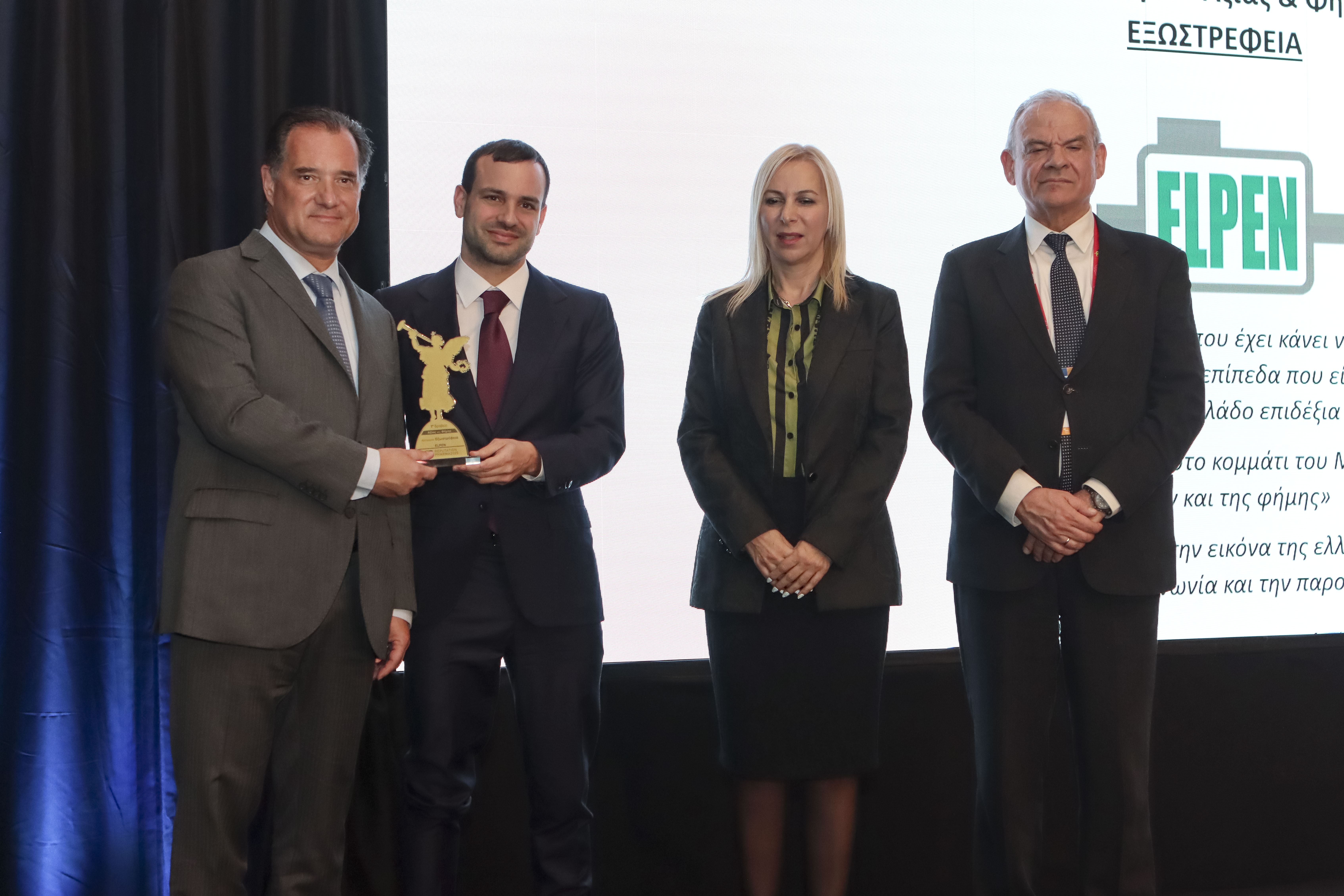 1o Βραβείο Αξίας και Φήμης στην κατηγορία Eξωστρέφεια απονεμήθηκε στην ELPEN (διακρίνονται από αριστερά) Άδωνις Γεωργιάδης, Υπουργός Υγείας, Γιάννης Κοντογιώργος, Senior Public Governmental Affairs Manager (ELPEN), Νάντια Γκογκοζώτου, ΜΕ Πρόεδρος ΕΟΠΠΥ και Πρόεδρος Επιτροπής Διαπραγμάτευσης, Ευάγγελος Μανωλόπουλος, Πρόεδρος ΕΟΦ