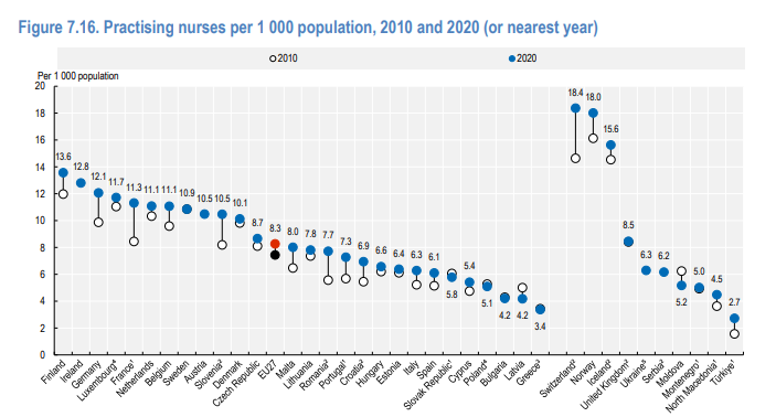 Μεταξύ 2010 και 2020, ο κατά κεφαλήν αριθμός νοσηλευτών αυξήθηκε στις περισσότερες χώρες της ΕΕ, αλλά όχι σε ορισμένες που είχα ήδη χαμηλή πυκνότητα το 2010 (π.χ. Λετονία και Σλοβακική Δημοκρατία), διευρύνοντας έτσι το χάσμα σε σχέση με άλλες χώρες και ο μέσος όρος της ΕΕ.