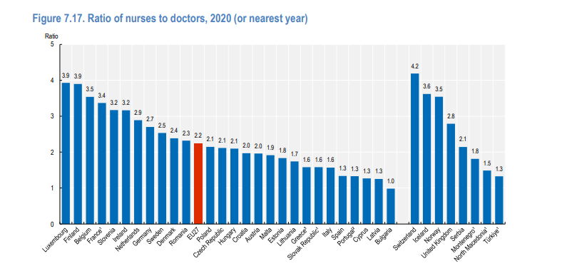 Οι νοσηλευτές υπερτερούν κατά πολύ των γιατρών στις περισσότερες χώρες της ΕΕ. Το 2020, υπήρχαν περισσότερες από δύο νοσοκόμες ανά γιατρό κατα μέσο όρο σε όλες τις χώρες της ΕΕ, με την αναλογία νοσηλευτών – ιατρών να φτάνει περίπου στους τέσσερις στο Λουξεμβούργο και τη Φινλανδία. Η αναλογία ήταν πολύ χαμηλότερη στις χώρες της Νότιας Ευρώπης και στη Λετονία.
