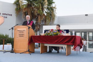ανθρωπιστικό χαρακτήρα. Με τον όρκο του Ιπποκράτη, όπως επισήμανε, αναλαμβάνουν τη δέσμευση να υπηρετήσουν με αφοσίωση, πάθος, συνέπεια και αυταπάρνηση τις αρχές, τις αξίες και το ανθρωπιστικό νόημα που αποπνέει η ιατρική παιδεία που έλαβαν. Εξέφρασε τέλος τη βεβαιότητα ότι θα αναδειχθούν σε άριστους πρεσβευτές του Πανεπιστημίου Κρήτης, τοποθετώντας την πατρίδα μας στον διεθνή χάρτη της αναγνωρισμένης και τεκμηριωμένης ιατρικής εκπαίδευσης.