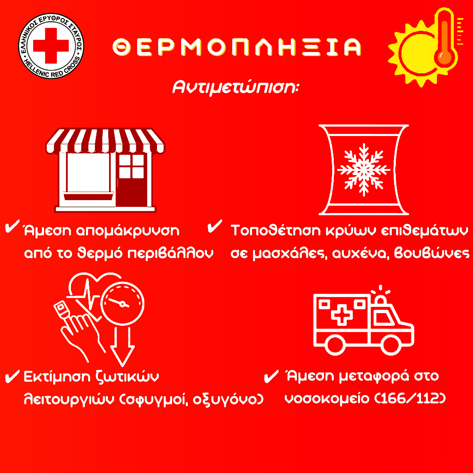 Με τον υδράργυρο να χτυπάει κόκκινο αυτές τις μέρες και το κύμα καύσωνα να είναι αισθητό σε όλες τις περιοχές της Ελλάδας, ο Ελληνικός Ερυθρός Σταυρός (Ε.Ε.Σ), προτείνει χρήσιμες οδηγίες για την αναγνώριση των συμπτωμάτων της θερμοπληξίας, αλλά και οδηγίες για την ορθή αντιμετώπισής της.