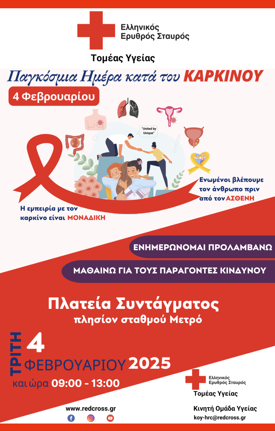 Ο Ελληνικός Ερυθρός Σταυρός (Ε.Ε.Σ.), με αφορμή την Παγκόσμια Ημέρα κατά του καρκίνου (4/2), διοργανώνει μεγάλη δράση ενημέρωσης, εκπαίδευσης και Ευαισθητοποίησης κατά του καρκίνου, την Τρίτη 4 Φεβρουαρίου 2025 και ώρες 09:00-13:00, στην Πλατεία Συντάγματος (πλησίον του Μετρό).