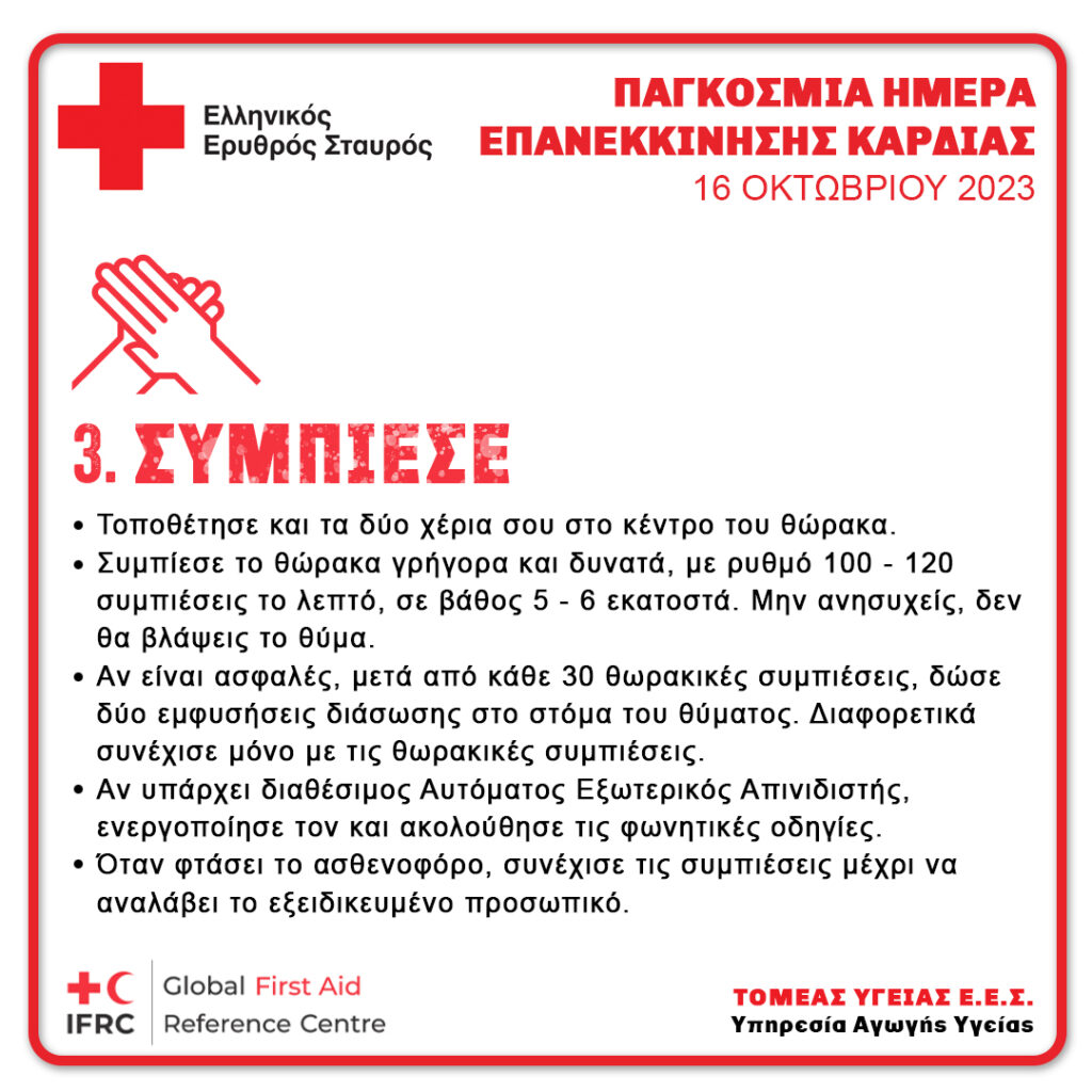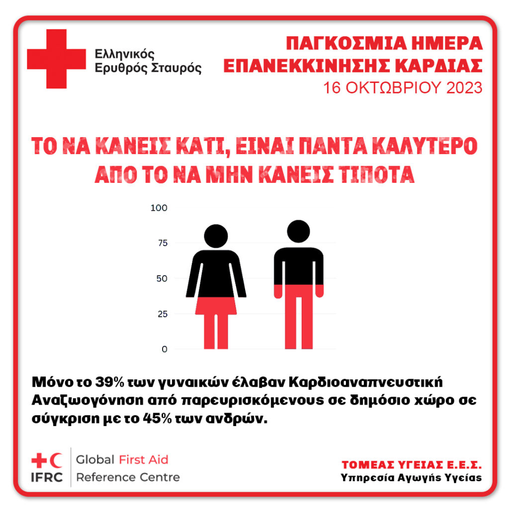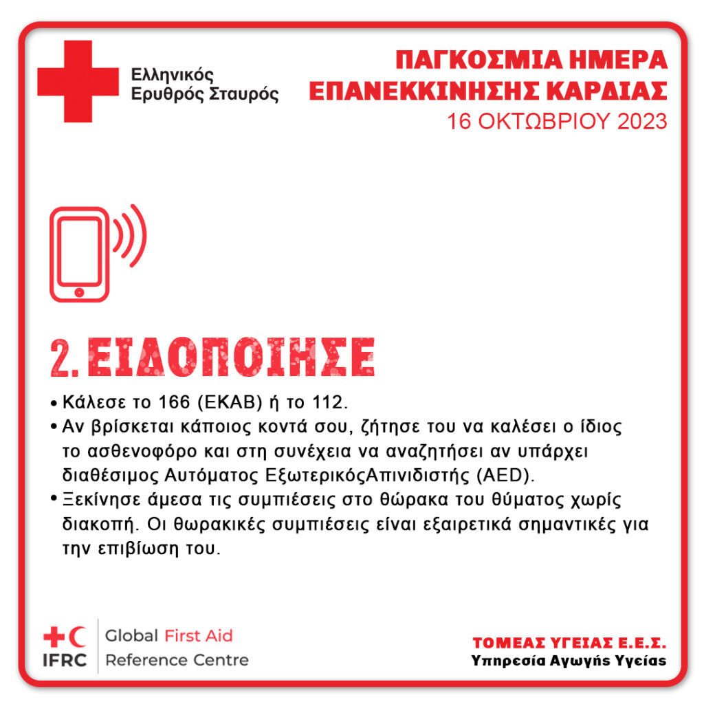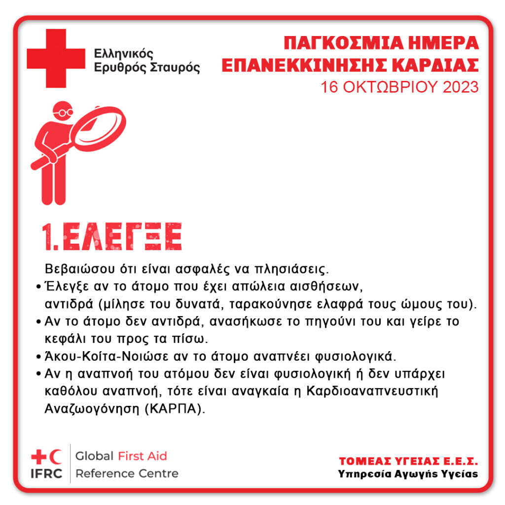 Ο Ελληνικός Ερυθρός Σταυρός με αφορμή την Παγκόσμια Ημέρα Επανεκκίνησης Καρδιάς (16/10) απευθύνει έκκληση ενημέρωσης και ευαισθητοποίησης για την  εκπαίδευσης όλων στην ΚΑΡΔΙΟΠΝΕΥΜΟΝΙΚΗ ΑΝΑΖΩΟΓΟΝΗΣΗ (ΚΑΡΠΑ).