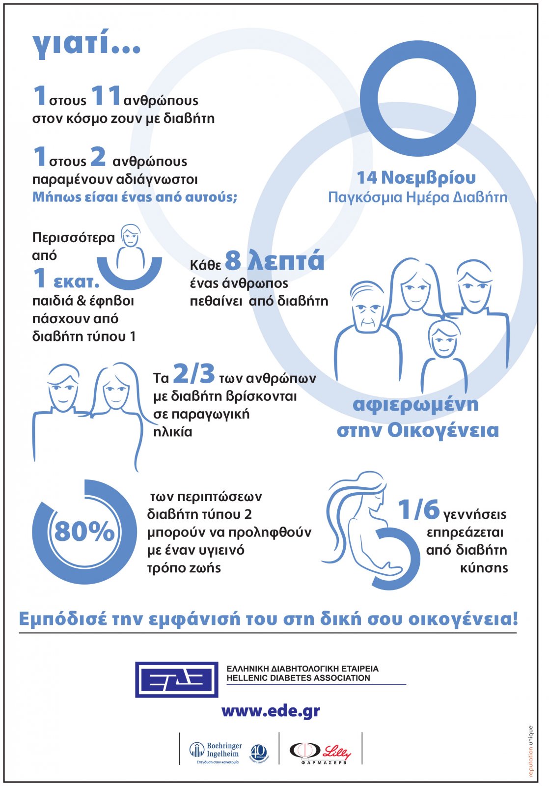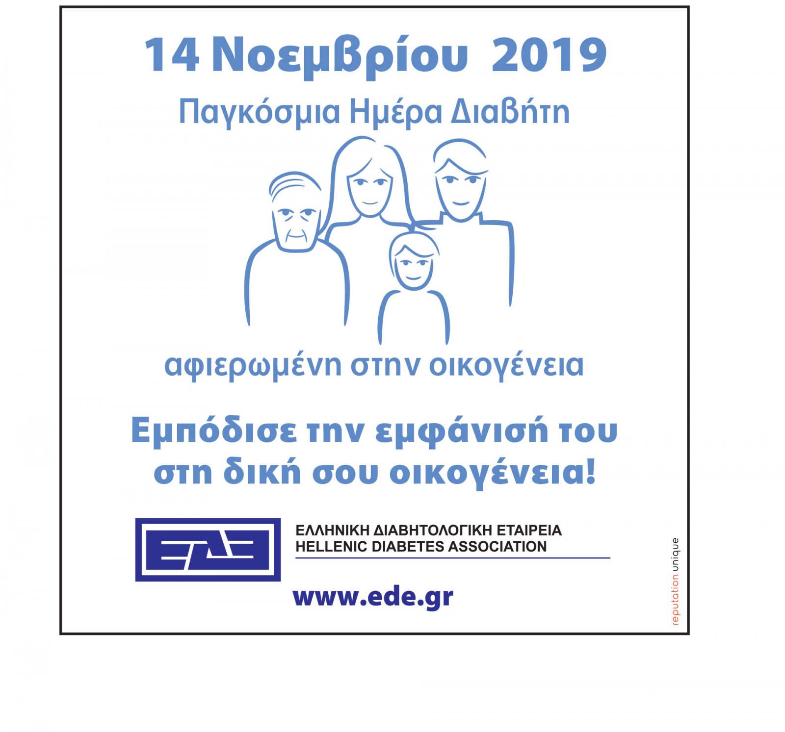 «Ανακάλυψε, Πρόλαβε, Διαχειρίσου το  Διαβήτη» – «Εμπόδισε την εμφάνιση του στην δική σου Οικογένεια», είναι για 2η χρονιά το μήνυμα της ενημερωτικής εκστρατείας κατά του Σακχαρώδη Διαβήτη  της Ελληνικής Διαβητολογικής Εταιρείας (ΕΔΕ), στο πλαίσιο της Παγκόσμιας Ημέρας Διαβήτη (14 Νοεμβρίου). Στόχος της εκστρατείας είναι η ευαισθητοποίηση του κοινού για τις επιπτώσεις του Σακχαρώδη Διαβήτη (ΣΔ), καθώς και η ανάδειξη και ενίσχυση του ρόλου της Οικογένειας στην Πρόληψη, Διαχείριση, Φροντίδα, και Εκπαίδευση, αναφορικά με το νόσημα.