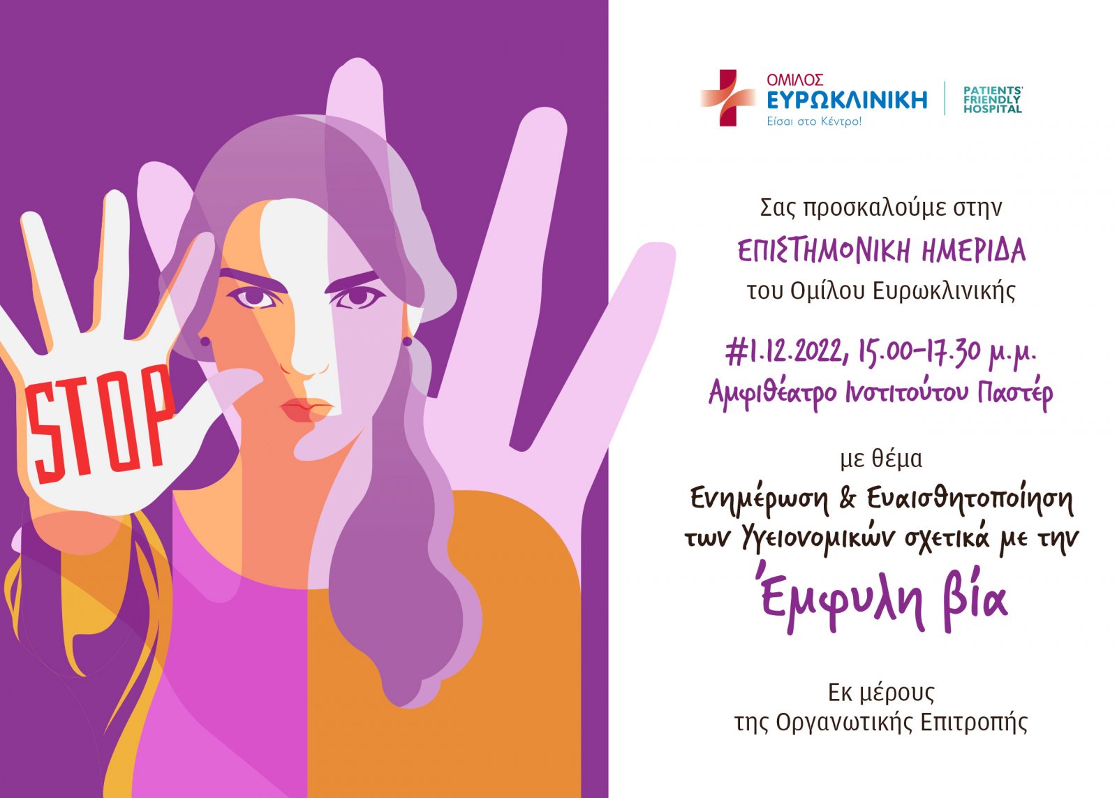 Ο Όμιλος Ευρωκλινικής, με αφορμή την Παγκόσμια Ημέρα για την Εξάλειψη της Βίας κατά των γυναικών, διοργανώνει την Επιστημονική Ημερίδα με θέμα «Ενημέρωση & Ευαισθητοποίηση των Υγειονομικών σχετικά με την Έμφυλη βία», την Πέμπτη 1 Δεκεμβρίου, στο Αμφιθέατρο του Ινστιτούτου Παστέρ, 15:00-17:30.
