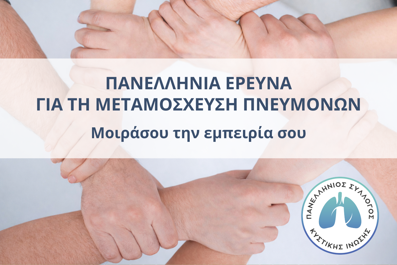 Πανελλήνια έρευνα καταγραφής εμπειριών, σκέψεων, αναγκών και της συνολικής στάσης της κοινότητας των ασθενών με αναπνευστικές νόσους σχετικά με τη μεταμόσχευση πνευμόνων στην Ελλάδα πραγματοποιεί ο Πανελλήνιος Σύλλογος Κυστικής Ίνωσης.