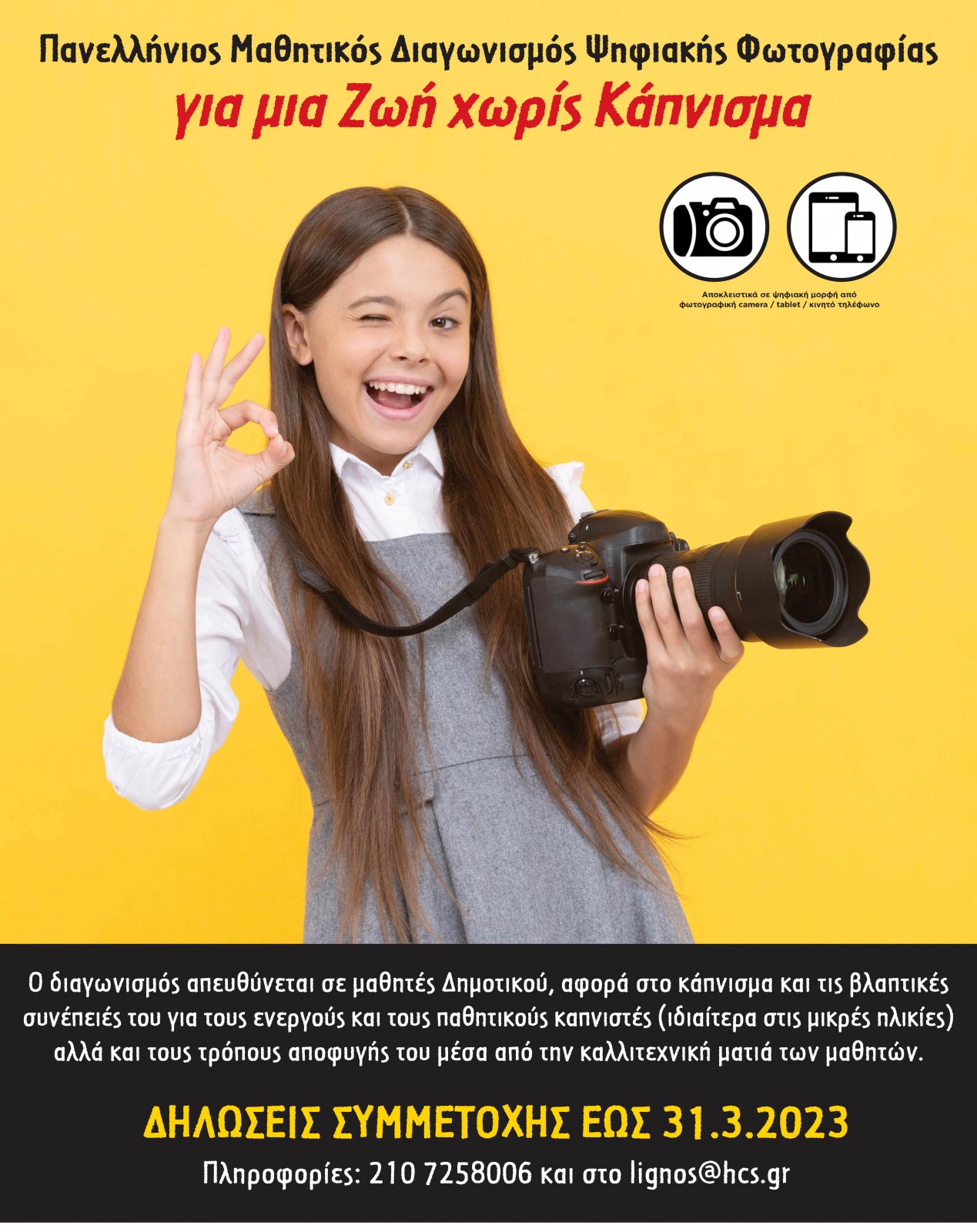 Πανελλήνιο Μαθητικό Διαγωνισμό Ψηφιακής Φωτογραφίας -εγκεκριμένο από το Υπουργείο Παιδείας- διοργανώνει και φέτος η Ελληνική Καρδιολογική Εταιρεία, συνεχίζοντας μια πολυετή προσπάθεια για ευαισθητοποίηση και ενημέρωση των μαθητών για το κάπνισμα, το παθητικό κάπνισμα και τις πολλαπλές επιπτώσεις του στο άτομο και την κοινωνία. Ο διαγωνισμός κάθε χρόνο πραγματοποιείται με αφορμή την Παγκόσμια Ημέρα Κατά του Καπνίσματος (31 Μαΐου).