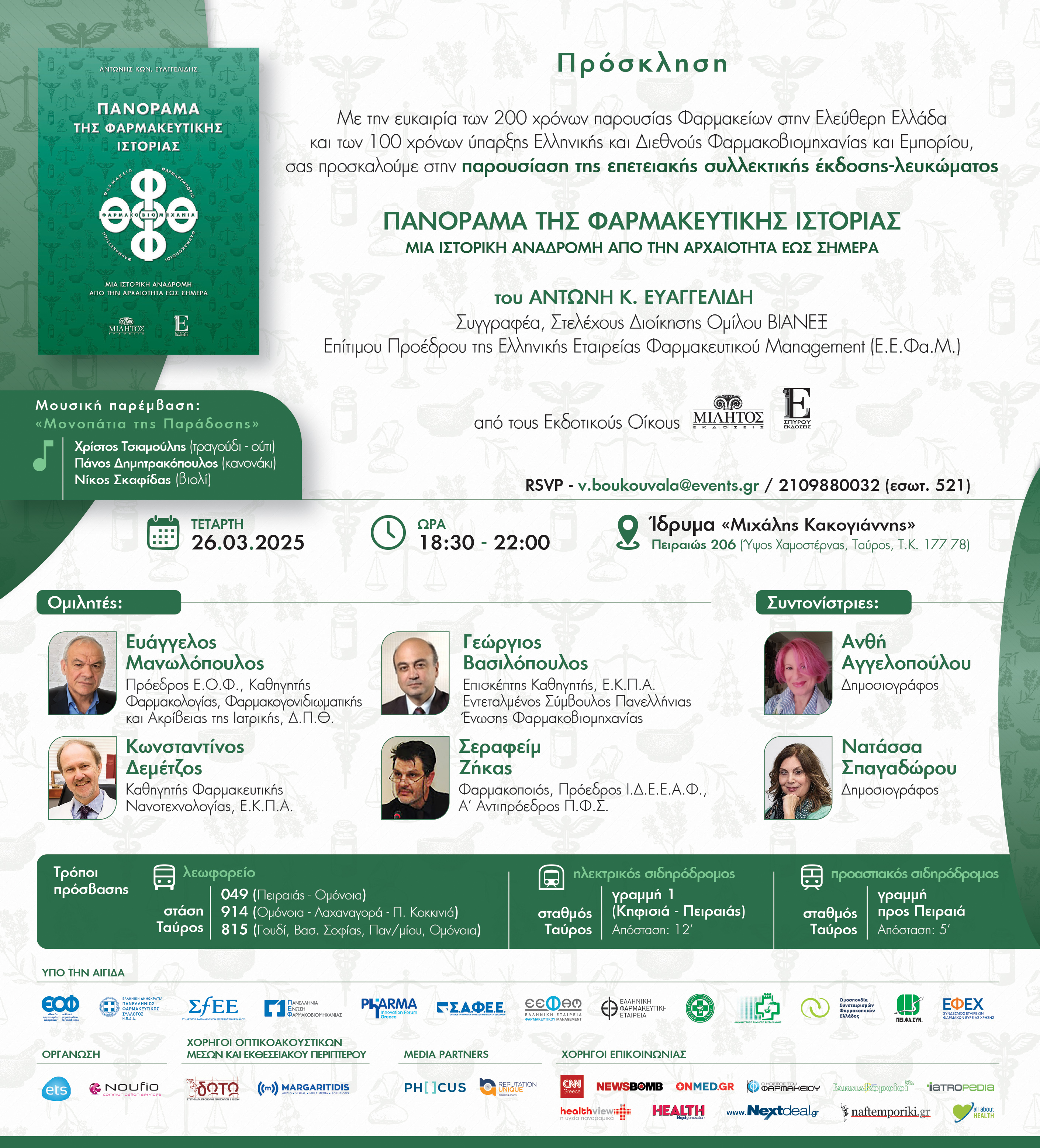 Ένα βιβλίο αφιερωμένο στη φαρμακευτική επιστήμη και τη διαχρονική της προσφορά στην ελληνική κοινωνία και δημόσια υγεία παρουσιάζουν στους επαγγελματίες του φαρμακευτικού κλάδου και στο αναγνωστικό κοινό ο συγγραφέας Αντώνης Ευαγγελίδης, Στέλεχος Διοίκησης Ομίλου ΒΙΑΝΕΞ και Επίτιμος Πρόεδρος της Ελληνικής Εταιρείας Φαρμακευτικού Management (Ε.Ε.Φα.Μ.) και οι Εκδοτικοί Οίκοι Μίλητος και Σπύρου. Η εκδήλωση παρουσίασης της επετειακής έκδοσης – λευκώματος «Πανόραμα της Φαρμακευτικής Ιστορίας: Μια ιστορική αναδρομή από την αρχαιότητα έως σήμερα» θα πραγματοποιηθεί την Τετάρτη 26 Μαρτίου και ώρα 18:30 στο Ίδρυμα «Μιχάλης Κακογιάννης», με τη συμμετοχή διακεκριμένων εκπροσώπων από τον χώρο της Υγείας και του Φαρμάκου και δημοσιογράφων.