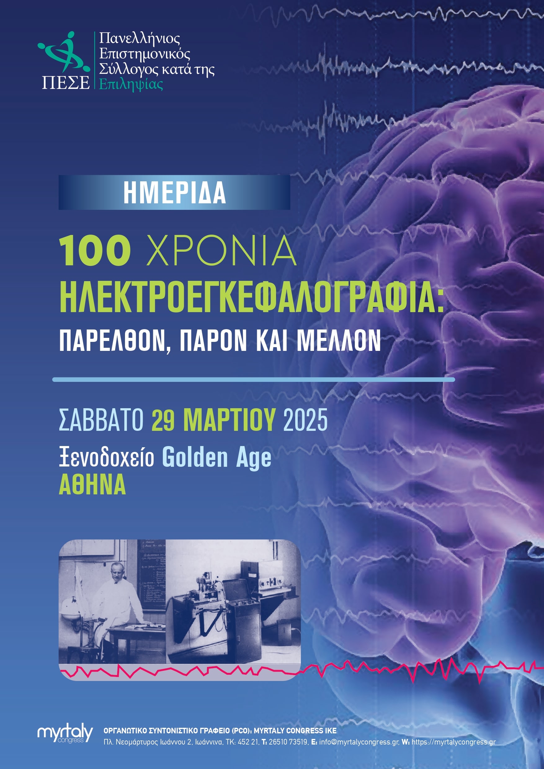 Αφιερωμένη στα 100 χρόνια Ηλεκτροεγκεφαλογραφίας, είναι η Ημερίδα που διοργανώνει ο Πανελλήνιος Επιστημονικός Σύλλογος κατά της Επιληψίας (Π.Ε.Σ.Ε.), το Σάββατο, 29 Μαρτίου 2025 και ώρες 10:00 έως 16:30 στο ξενοδοχείο «Golden Age», στην Αθήνα.
