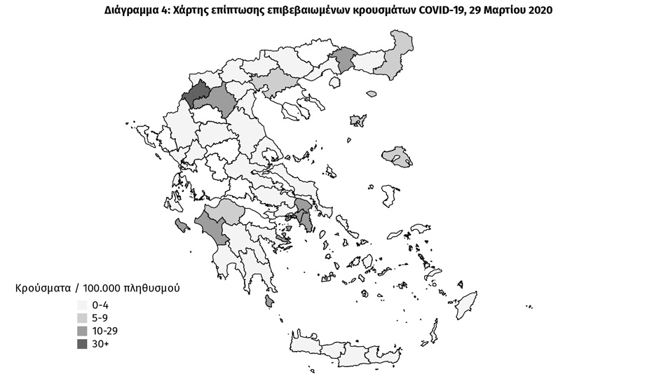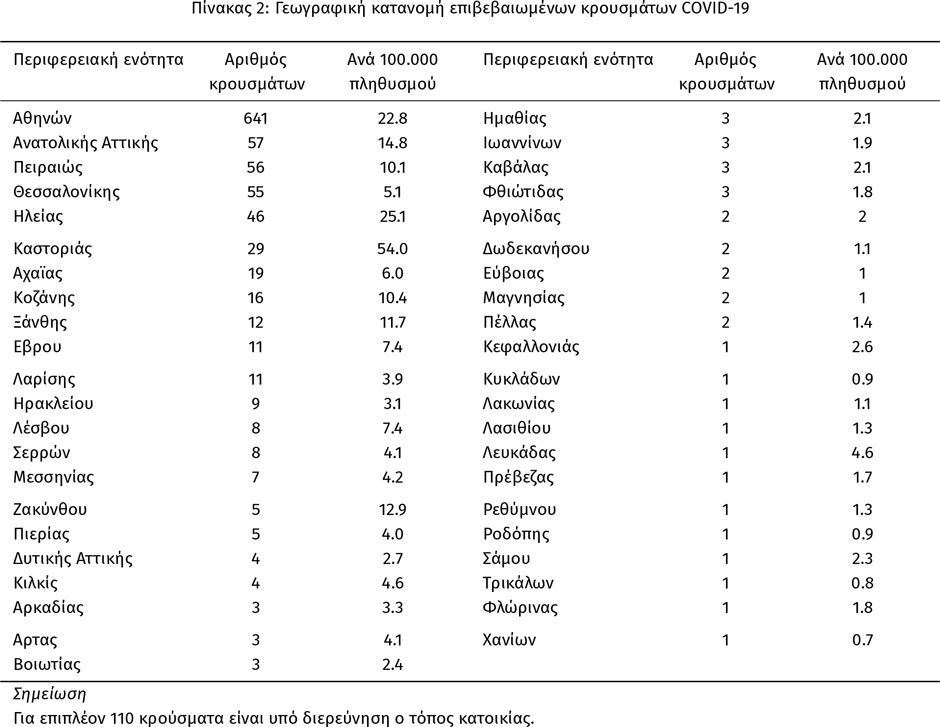 Όσον αφορά τη γεωγραφική κατανομή των κρουσμάτων στην Ελλάδα, η Αττική συγκεντρώνει τον μεγαλύτερο αριθμό ενώ ακολουθούν η Θεσσαλονίκη, η Ηλεία, η Καστοριά, η Αχαΐα , η Κοζάνη και η Ξάνθη, όπου υπήρξαν εστίες νέων μολύνσεων. Όπως αποτυπώνεται και στον χάρτη επίπτωσης επιβεβαιωμένων κρουσμάτων του ΕΟΔΥ, ελάχιστες είναι πλέον οι περιοχές της χώρας όπου προς το παρόν, δεν έχει καταγράφει επισήμως κάποιο κρούσμα κορονοϊού.