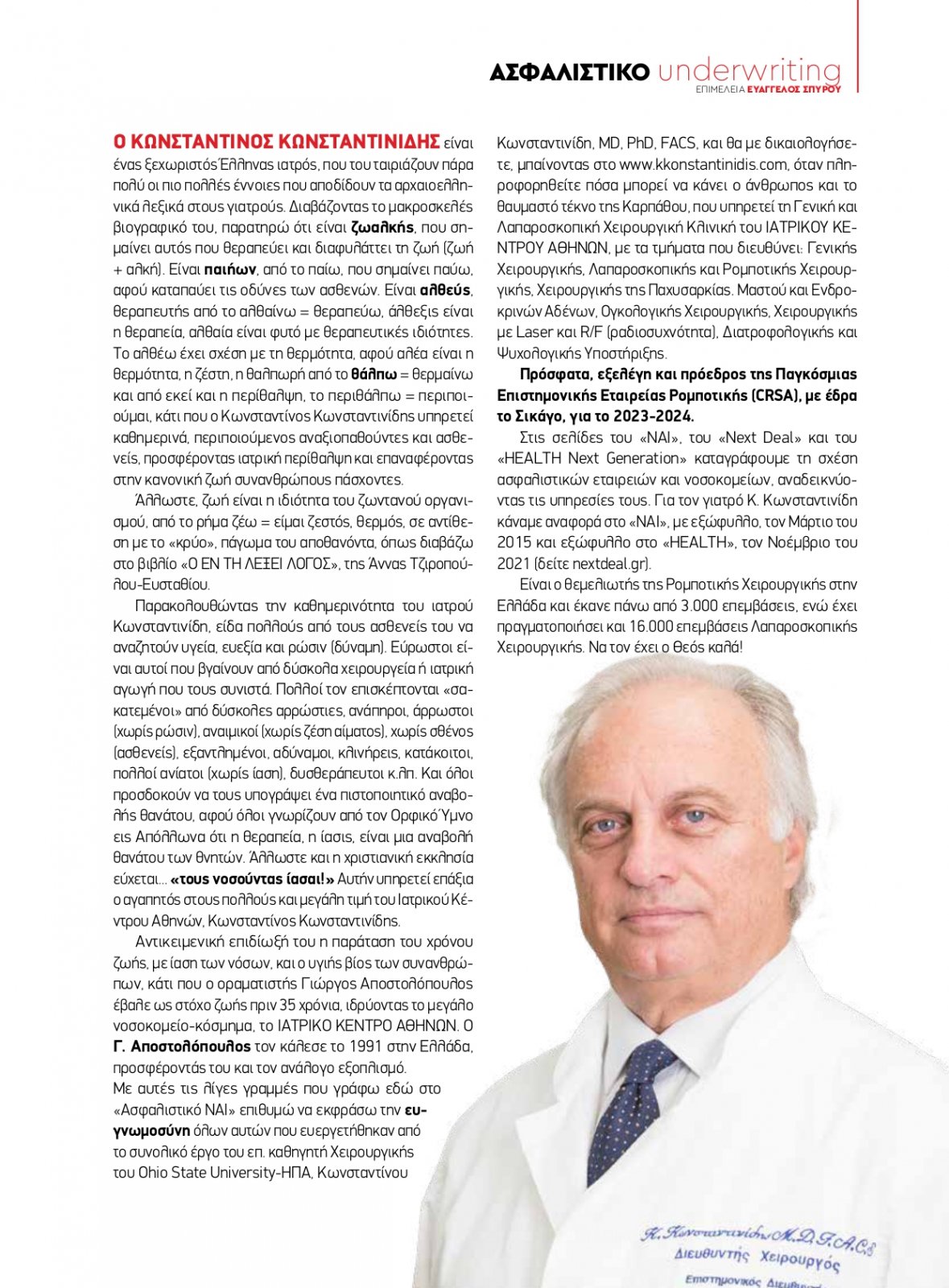 Στις σελίδες του ΝΑΙ, Next Deal και HEALTH Next Generation, καταγράφουμε τη σχέση Ασφαλιστικών Εταιρειών και Νοσοκομείων, αναδεικνύοντας τις υπηρεσίες τους. Για τον γιατρό Κ. Κωνσταντινίδη κάναμε αναφορά στο «ΝΑΙ», με εξώφυλλο, τον Μάρτιο του 2015 και εξώφυλλο του HEALTH, το Νοέμβριο του 2021 (δείτε nextdeal.gr).