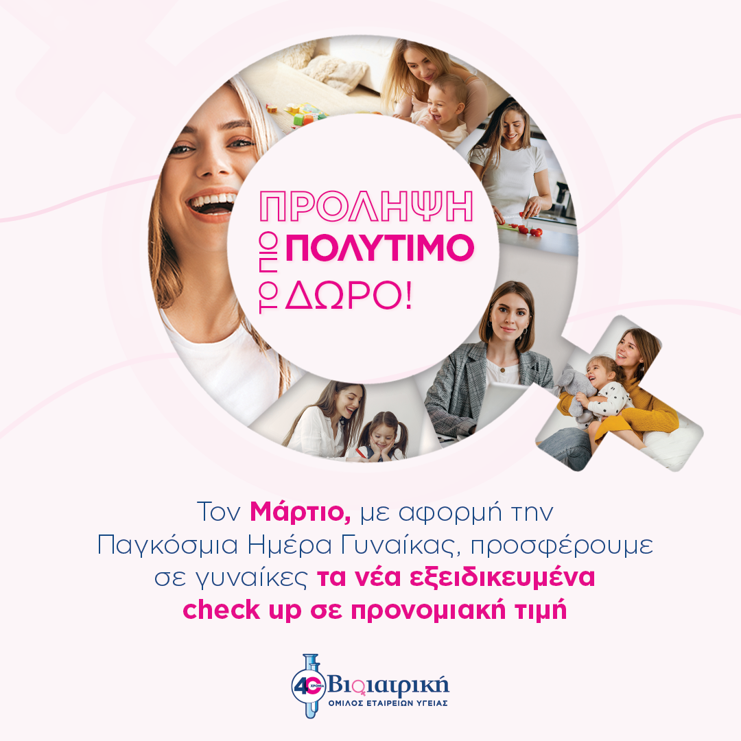 Ο Όμιλος ΒΙΟΙΑΤΡΙΚΗ προσφέρει νέα προνομιακά προγράμματα προληπτικού ελέγχου για όλες τις γυναίκες, με αφορμή την ημέρα της Γυναίκας (8 Μαρτίου). Έως τις 31 Μαρτίου διατίθενται σε προνομιακή τιμή νέα προγράμματα check up τα οποία έχουν σχεδιαστεί από το Κέντρο Προληπτικής Ιατρικής και Μακροβιότητας για τις ιδιαίτερες ανάγκες των γυναικών σε κάθε ηλικία.
