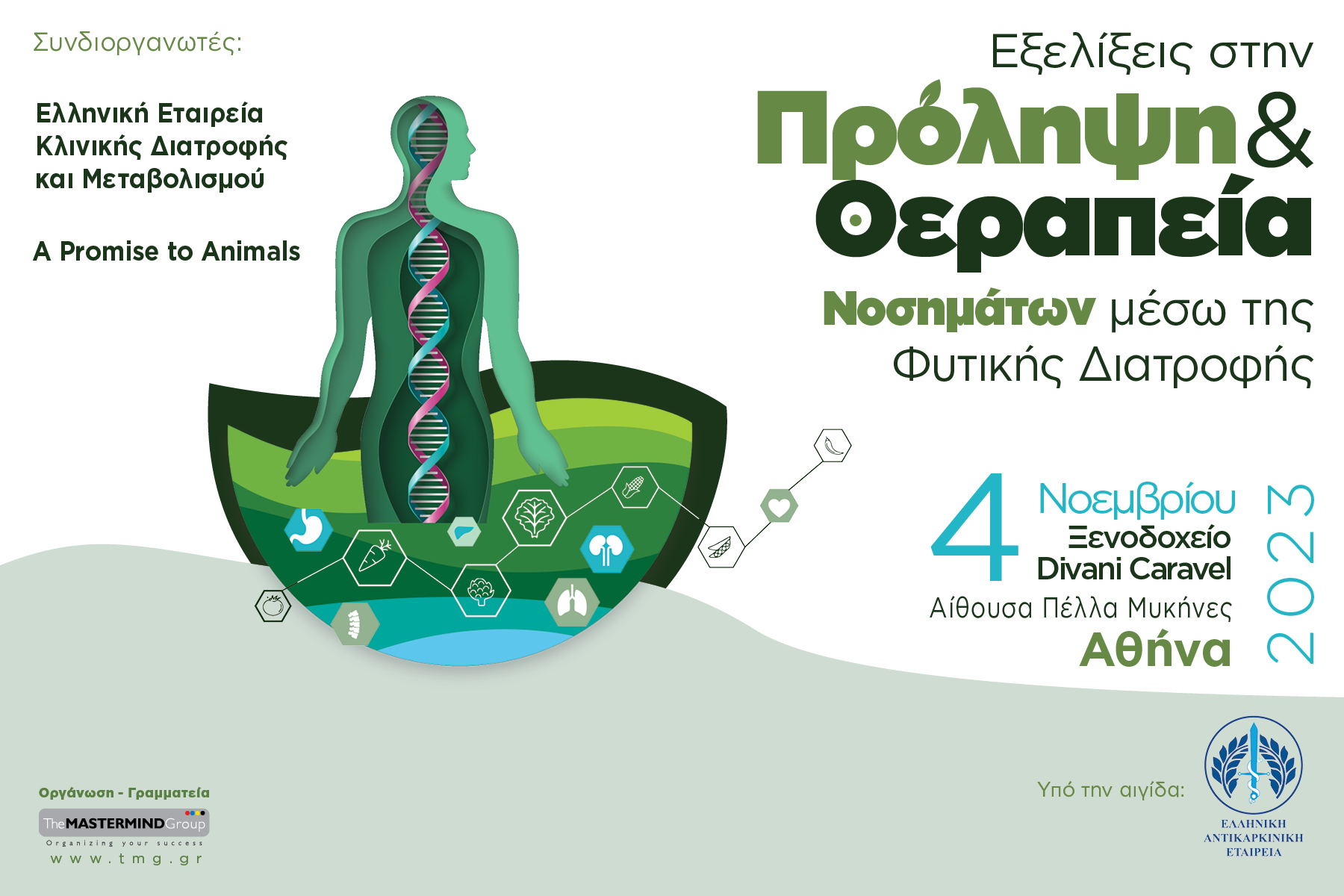 Η 1η Επιστημονική Ημερίδα για τη Φυτοφαγική Διατροφή πραγματοποιείται το Σάββατο 4 Νοεμβρίου στην Αθήνα, με διεθνή συμμετοχή. Συνδιοργανωτές είναι η ΜΚΟ Α PROMISE to ANIMALS και η Ελληνική Εταιρεία Κλινική Διατροφής και Μεταβολισμού, ενώ η διοργάνωση τελεί υπό την αιγίδα της Ελληνικής Αντικαρκινικής Εταιρείας.