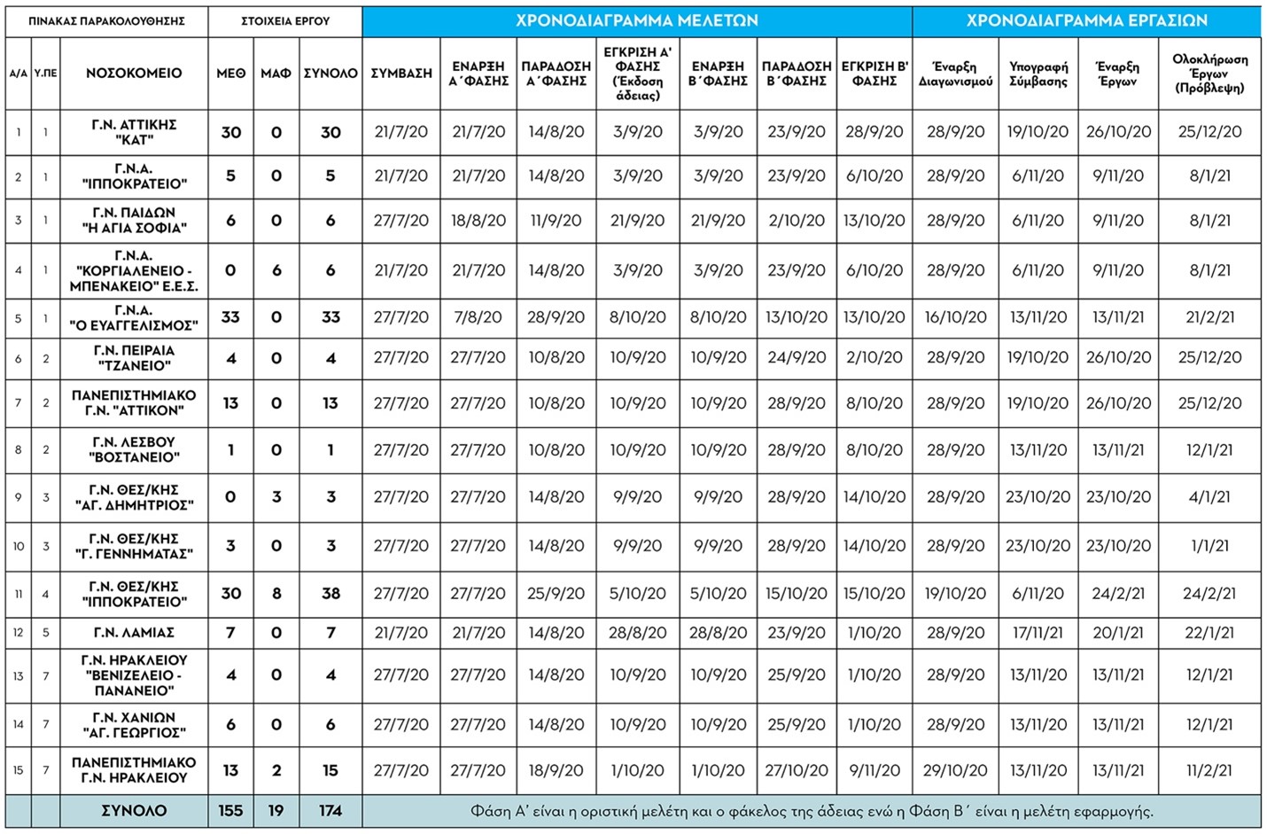 Ήδη μέσα στις γιορτές των Χριστουγέννων, έχουν προγραμματιστεί να παραδοθούν οι χώροι, στα νοσοκομεία ΚΑΤ, Tζάνειο, Αττικόν καθώς και Άγιος Δημήτριος και Γ. Γεννηματάς, στη Θεσσαλονίκη, οι οποίοι αντιστοιχούν σε 53 νέες κλίνες ΜΕΘ και ΜΑΦ. Μέχρι τα μέσα Ιανουαρίου 2021 θα έχουν παραδοθεί οι χώροι για άλλες 28 κλίνες σε Ιπποκράτειο Αθήνας, Παίδων Αγία Σοφία, Κοργιαλένειο-Μπενάκειο, Βοστάνειο Λέσβου, Βενιζέλειο στο Ηράκλειο και Άγιος Γεώργιος στα Χανιά. Στο τέλος Ιανουαρίου 2021 αναμένεται να ολοκληρωθεί και το έργο για τις 7 νέες κλίνες στο Νοσοκομείο Λαμίας. Οι χώροι για τις υπόλοιπες 86 κλίνες θα παραδοθούν, στα τέλη Φεβρουαρίου 2021, στο Ιπποκράτειο Θεσσαλονίκης, στο Πανεπιστημιακό Ηρακλείου και στον Ευαγγελισμό, στον οποίο θα δημιουργηθούν 33 νέες κλίνες.