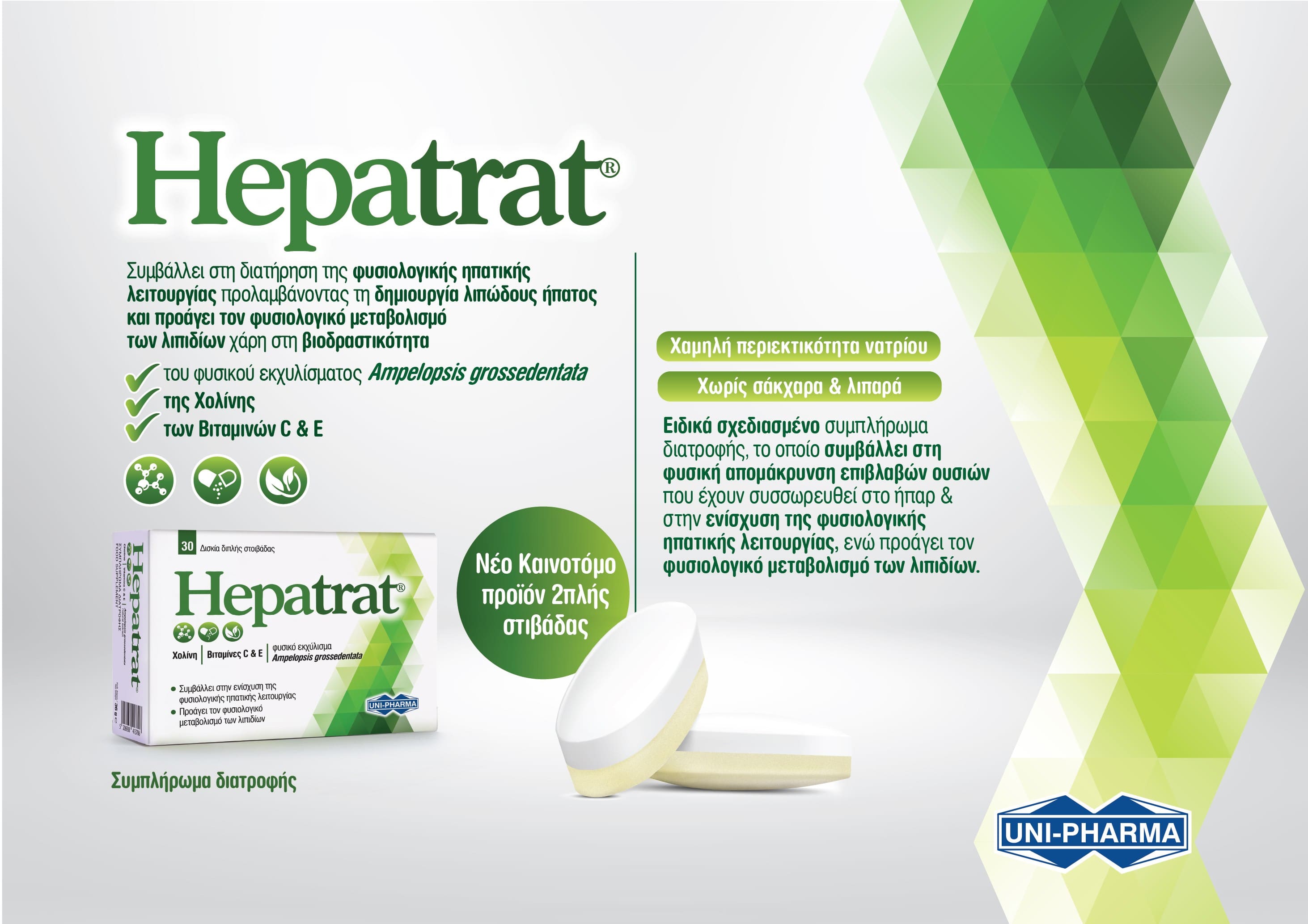 Το Hepatrat, συμπλήρωμα διατροφής από τη UNI-PHARMA, συμβάλλει στη διατήρηση της φυσιολογικής ηπατικής λειτουργείας προλαμβάνοντας τη δημιουργία λιπώδους ήπατος και προάγει τον φυσιολογικό μεταβολισμό των λιπιδίων.