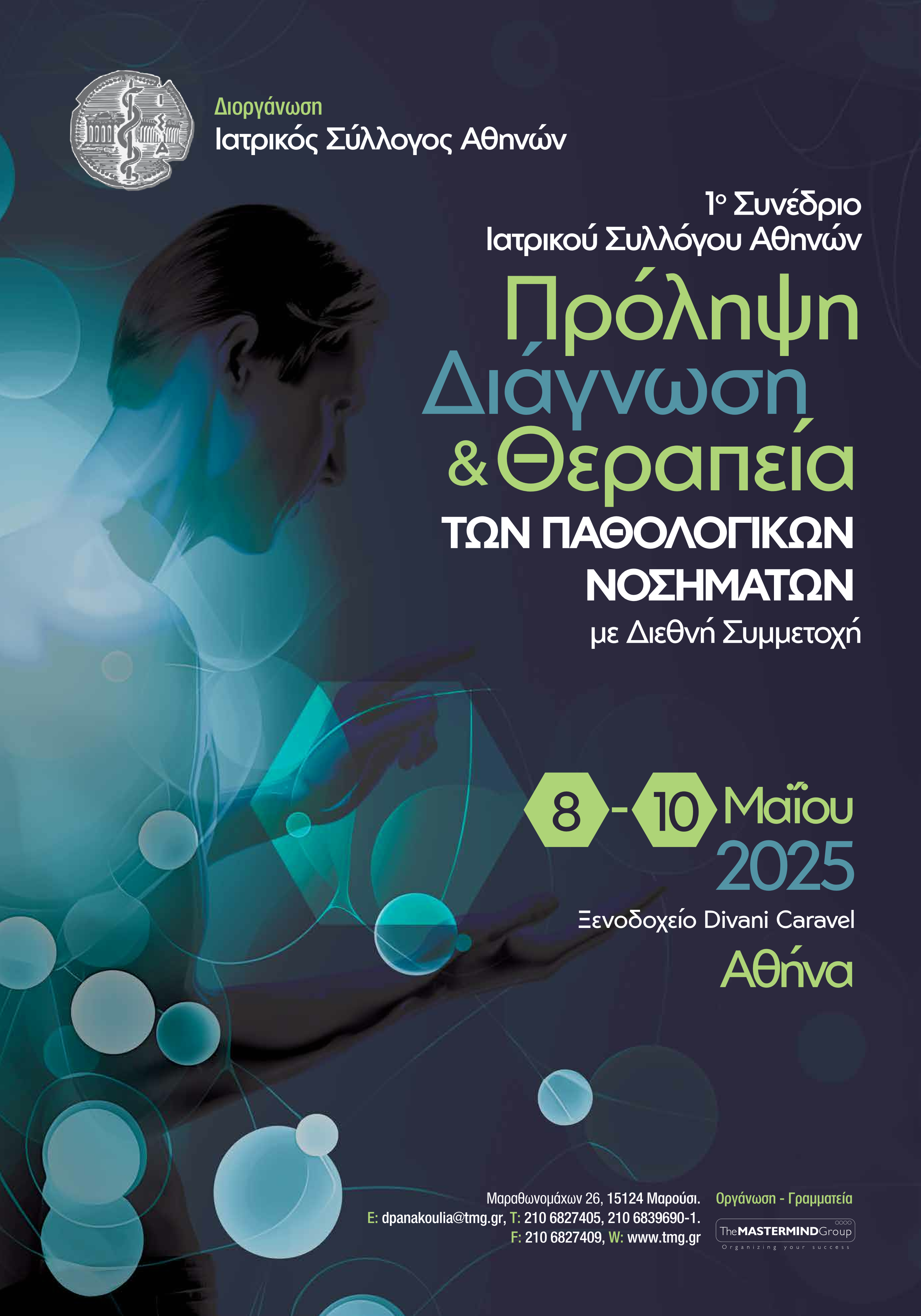 Ο Ιατρικός Σύλλογος Αθηνών διοργανώνει το 1ο Συνέδριό του με επίκεντρο τις Παθολογικές Ειδικότητες, με τίτλο «Πρόληψη, Διάγνωση και Θεραπεία των Παθολογικών Νοσημάτων», το οποίο θα πραγματοποιηθεί από τις 8 έως τις 10 Μαΐου 2025, στο ξενοδοχείο Divani Caravel στην Αθήνα. Το συνέδριο φιλοδοξεί να αποτελέσει ένα σημαντικό βήμα για την ανάδειξη των σύγχρονων εξελίξεων και προκλήσεων στην εσωτερική παθολογία, με τη συμμετοχή κορυφαίων επιστημόνων.
