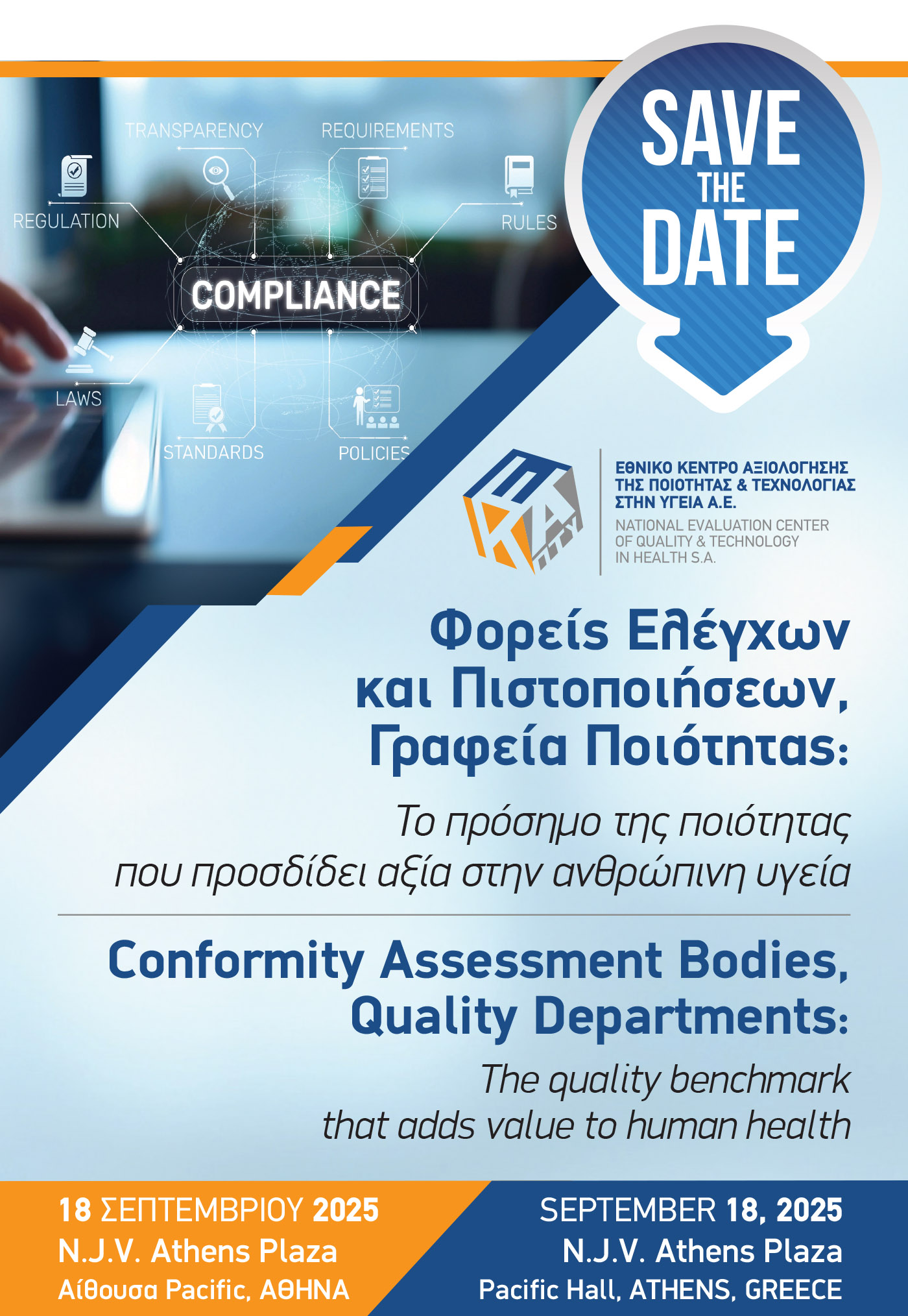 Το Εθνικό Κέντρο Αξιολόγησης της Ποιότητας & Τεχνολογίας στην Υγεία (Ε.Κ.Α.Π.Τ.Υ. Α.Ε.) διοργανώνει συνέδριο με τίτλο «Φορείς Ελέγχων και Πιστοποιήσεων, Γραφεία Ποιότητας: Το πρόσημο της ποιότητας που προσδίδει αξία στην ανθρώπινη υγεία», την Πέμπτη 18 Σεπτεμβρίου 2025 στο ξενοδοχείο N.J.V Athens Plaza (Αίθουσα Pacific) στην Αθήνα.