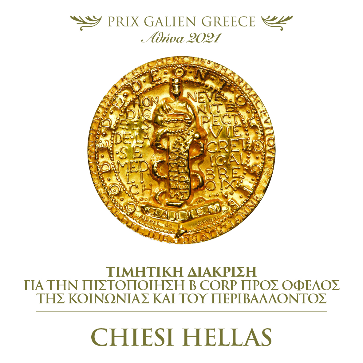 Η Chiesi Hellas απέσπασε τιμητική διάκριση στην 5η τελετή απονομής των φαρμακευτικών βραβείων Prix Galien, ως τιμώμενη εταιρεία για την πιστοποίηση B Corp (Benefit Corporations) και τη συνεισφορά της στην κοινωνία και το περιβάλλον. Τα βραβεία Prix Galien αναγνωρίζουν και επιβραβεύουν εξαιρετικά φαρμακευτικά επιτεύγματα που οδηγούν στην αναβάθμιση της ποιότητας ζωής ή σώζουν ζωές μέσω της ανάπτυξης καινοτόμων σκευασμάτων και διαγνωστικών εργαλείων.