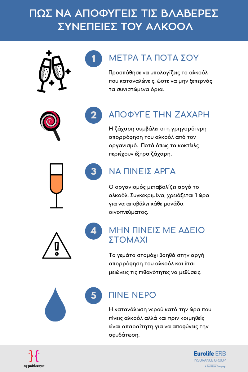 Γενικά, όταν καταναλώσεις πολύ αλκοόλ (ακόμα και αν δεν το κάνεις συχνά) να θυμάσαι πως εκείνη την ώρα ο οργανισμός σου πασχίζει να μεταβολίσει το αλκοόλ, ανεβάζει καρδιαγγειακούς παλμούς, κάνει κατακράτηση υγρών και ένας από τους μεγαλύτερους κινδύνους που διατρέχεις είναι να αφυδατωθείς.