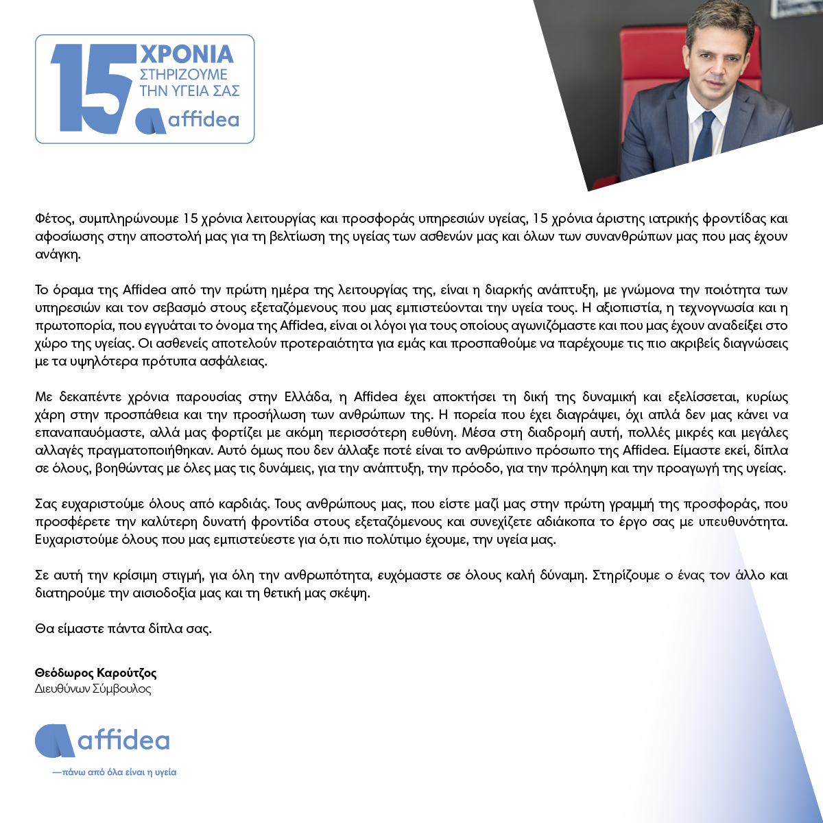Ακολουθεί το μήνυμα του Διευθύνοντος Συμβούλου της Affidea Ελλάδος κ. Θεόδωρου Καρούτζου, με αφορμή τα 15 χρόνια παρουσίας του Ομίλου Διαγνωστικών Κέντρων Affidea στην Ελλάδα:
