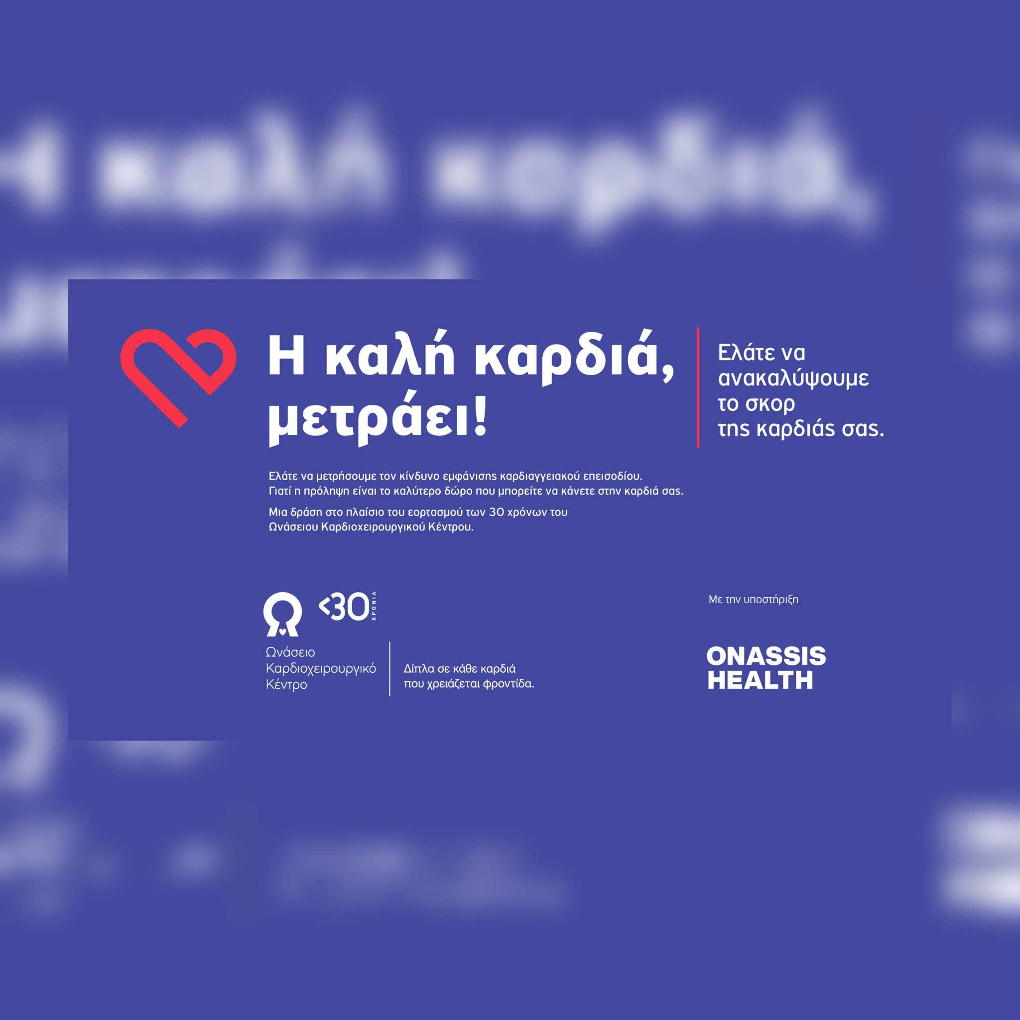 Όπως μπορεί κανείς γρήγορα να διαβάσει στην επίσημη ιστοσελίδα της Παγκόσμιας Καρδιολογικής Ομοσπονδίας (World Heart Federation) (https://world-heart-federation.org/world-heart-day/), οι καρδιαγγειακές παθήσεις και το εγκεφαλικό επεισόδιο αποτελούν αιτίες θανάτου για 20 εκατομμύρια ανθρώπους ετησίως στον κόσμο. Το 80% ωστόσο από αυτές τις οδυνηρές απώλειες θα μπορούσε να είχε αποφευχθεί, αν οι πολίτες γνώριζαν ενδεδειγμένους τρόπους πρόληψης των καρδιαγγειακών νοσημάτων. Γι’ αυτό το Ωνάσειο Καρδιοχειρουργικό Κέντρο, στο πλαίσιο των δράσεων εορτασμού των 30 χρόνων λειτουργίας του και προσφοράς στους Έλληνες ασθενείς, διοργανώνει μια δράση ενημέρωσης και ευαισθητοποίησης με την ονομασία “Heartscore – Η καλή καρδιά μετράει”, γιατί ο έλεγχος είναι ο πλέον σημαντικός τρόπος πρόληψης.