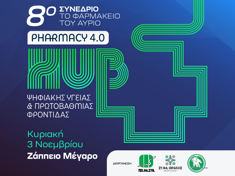 Το φετινό 8ο Συνέδριο του Ομίλου ΠΕΙΦΑΣΥΝ «Το Φαρμακείο του Αύριο», το οποίο για πρώτη φορά διοργανώνεται με τη συνεργασία του ΣΥ.ΦΑ. Θράκης και του ΣΥΦΑΝΟΠΠΕ, θα διεξαχθεί την Κυριακή 3 Νοεμβρίου 2024 στο Ζάππειο Μέγαρο στην Αθήνα, από τις 9:45π.μ. έως τις 3μ.μ. Τίτλος του φετινού δια ζώσης Συνεδρίου είναι:
