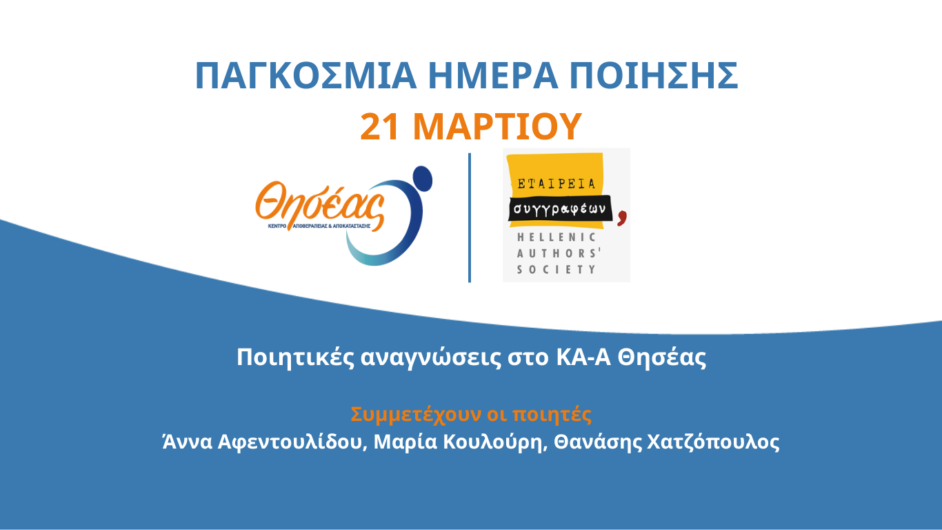 Με αφορμή την Παγκόσμια Ημέρα Ποίησης, το Κέντρο Αποθεραπείας & Αποκατάστασης Θησέας, σε συνεργασία με την Εταιρεία Συγγραφέων, διοργανώνει μια ξεχωριστή εκδήλωση αφιερωμένη στους ασθενείς του! Πιο συγκεκριμένα,