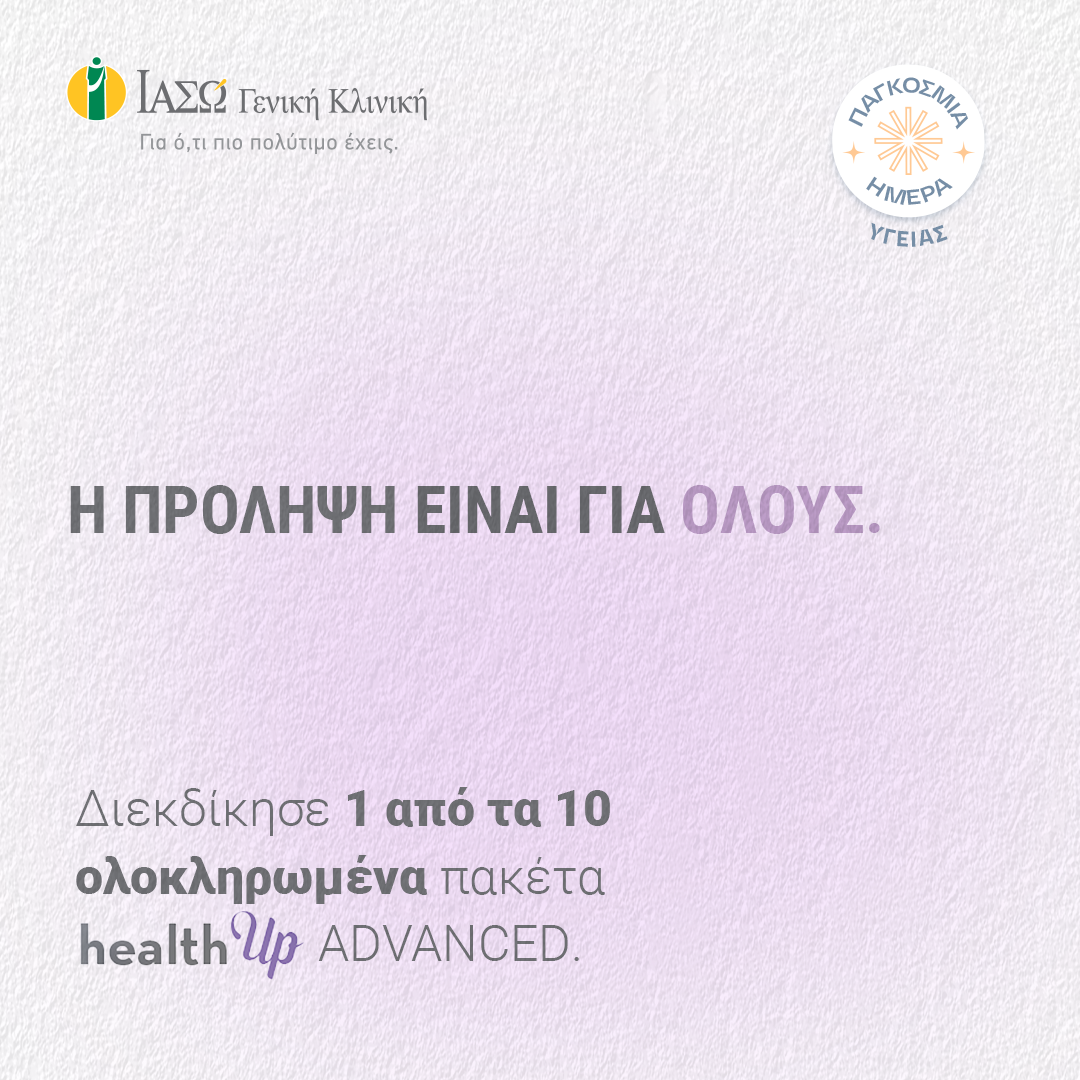 Το ΙΑΣΩ Γενική Κλινική γιορτάζει την Παγκόσμια Ημέρα Υγείας (7 Απριλίου) και προσφέρει 10 προληπτικούς ελέγχους υγείας healthUp ADVANCED MEN ή WOMEN στο Τμήμα Check –