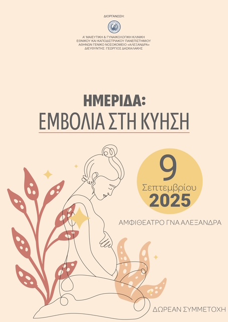 Η Πανεπιστημιακή Κλινική του Νοσοκομείου «Αλεξάνδρα» διοργανώνει Ημερίδα με θέμα τον εμβολιασμό κατά την εγκυμοσύνη, την Τρίτη 9 Σεπτεμβρίου 2024, στο Αμφιθέατρο του Νοσοκομείου, από