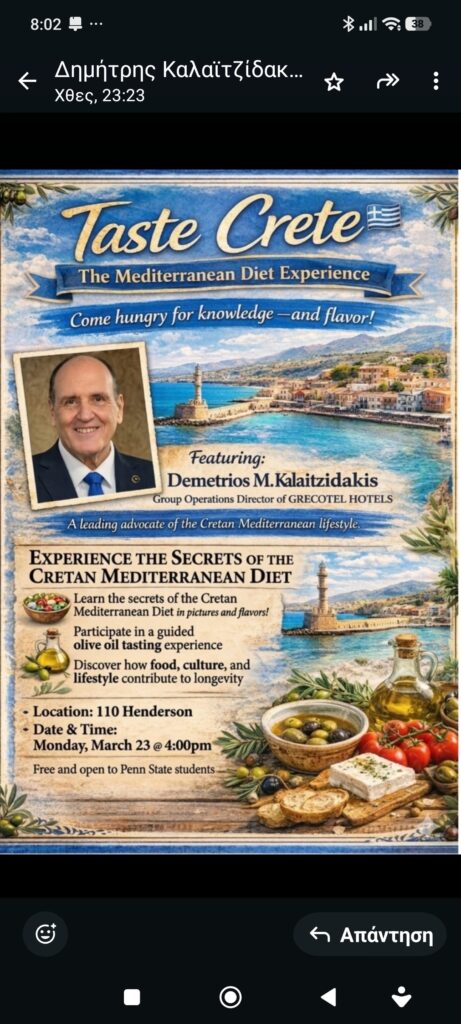 Η κρητική διατροφή και ο υγιεινός μεσογειακός τρόπος ζωής αναμένεται να βρεθούν στο επίκεντρο ειδικής παρουσίασης που θα πραγματοποιηθεί τη Δευτέρα 23 Μαρτίου 2026 στο