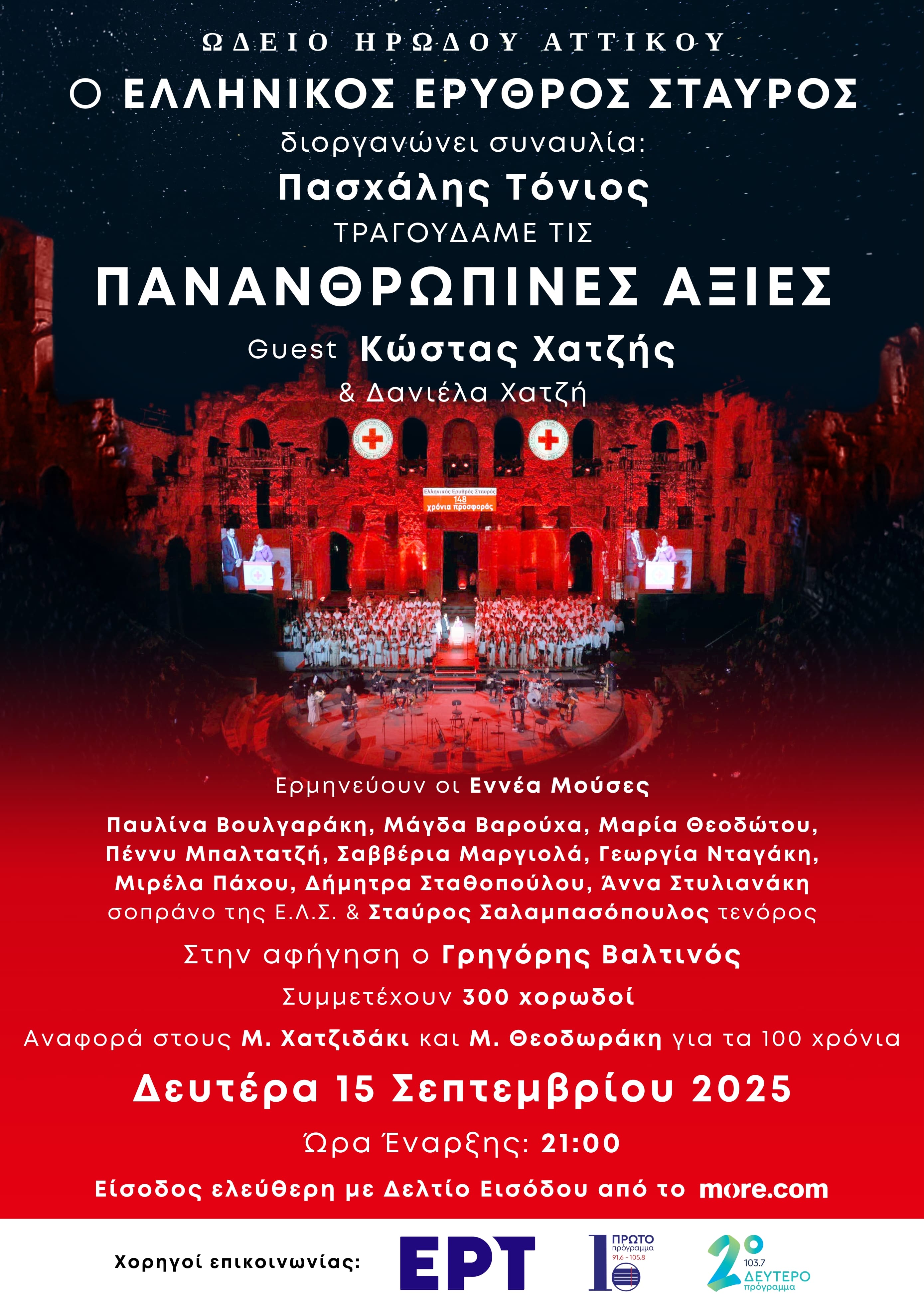 Ο Ελληνικός Ερυθρός Σταυρός (E.E.Σ), την Δευτέρα 15 Σεπτεμβρίου 2025, στις 21:00, στο Ηρώδειο, διοργανώνει μεγάλη συναυλία, με τίτλο: «Τραγουδάμε τις Πανανθρώπινες αξίες», σε Σύνθεση – καλλιτεχνική επιμέλεια Πασχάλη Τόνιου. Ένα ξεχωριστό μουσικό ταξίδι, για τον Άνθρωπο, την Ελπίδα και την Αλληλεγγύη, σε μια εποχή που η ανθρωπότητα αντιμετωπίζει σοβαρές προκλήσεις. Guest εμφάνιση ο σπουδαίος Κώστας Χατζής (μαζί του η Δανιέλα Χατζή), ενώ την αφήγηση υπογράφει ο Γρηγόρης Βαλτινός.