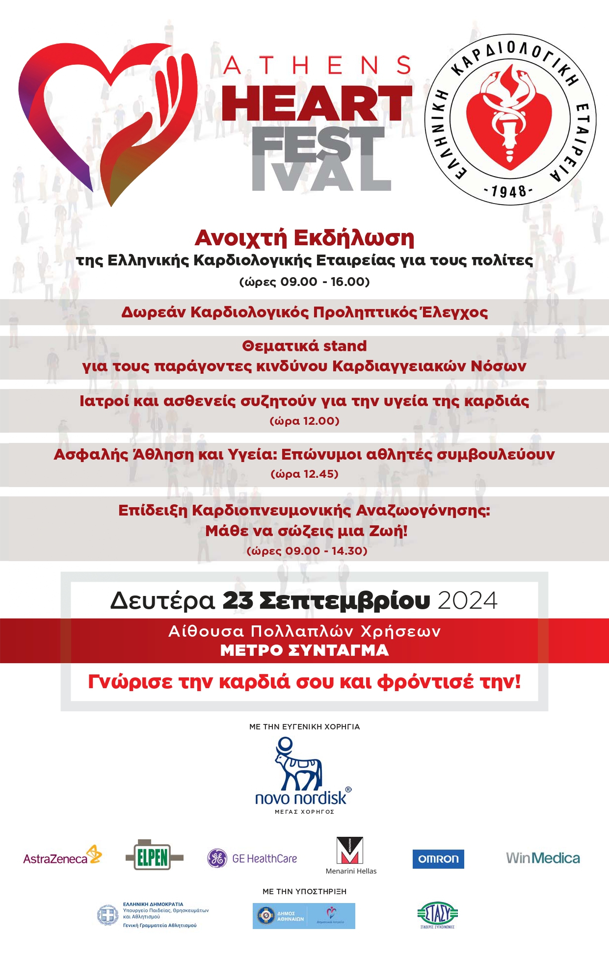 Το Athens Heart Festival 2024 είναι η μεγάλη κοινωνική δράση της Ελληνικής Καρδιολογικής Εταιρείας, που θα πραγματοποιηθεί τη Δευτέρα 23 Σεπτεμβρίου 2024 (ώρες 09.00-16.00) στην Αίθουσα Πολλαπλών Χρήσεων του σταθμού «ΜΕΤΡΟ ΣΥΝΤΑΓΜΑ», με αφορμή την Παγκόσμια Ημέρα Καρδιάς 2024.