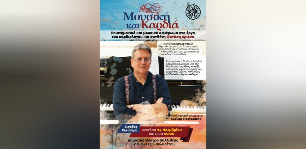 Μουσική και καρδιά: Επιστημονικό και μουσικό αφιέρωμα στο έργο του καρδιολόγου και συνθέτη Θανάση Δρίτσα την Δευτέρα 24 Νοεμβρίου στις 20:00 στο Δημοτικό Θέατρο Καλλιθέας.