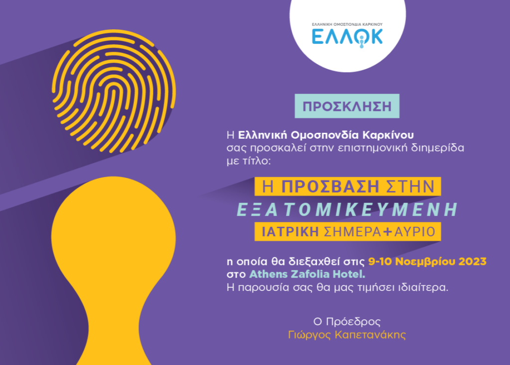 Η Ελληνική Ομοσπονδία Καρκίνου – ΕΛΛΟΚ μας προσκαλεί στην επιστημονική διημερίδα με τίτλο “Η πρόσβαση στην εξατομικευμένη ιατρική σήμερα και αύριο”, η οποία θα πραγματοποιηθεί