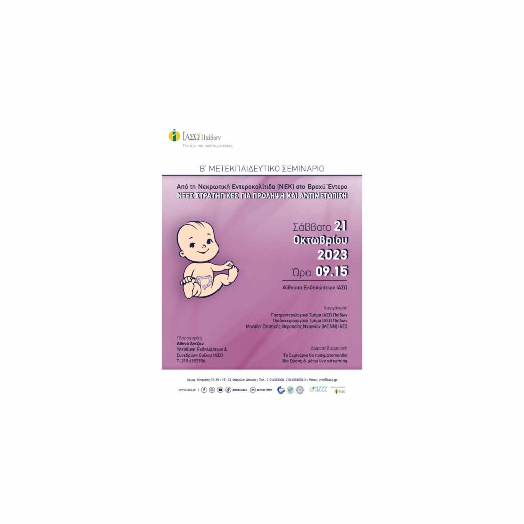 Το Β’ Μετεκπαιδευτικό Σεμινάριο του ΙΑΣΩ Παίδων με θέμα «Από τη νεκρωτική εντεροκολίτιδα (ΝΕΚ) στο βραχύ έντερο: Νέες στρατηγικές για πρόληψη και αντιμετώπιση», θα πραγματοποιηθεί