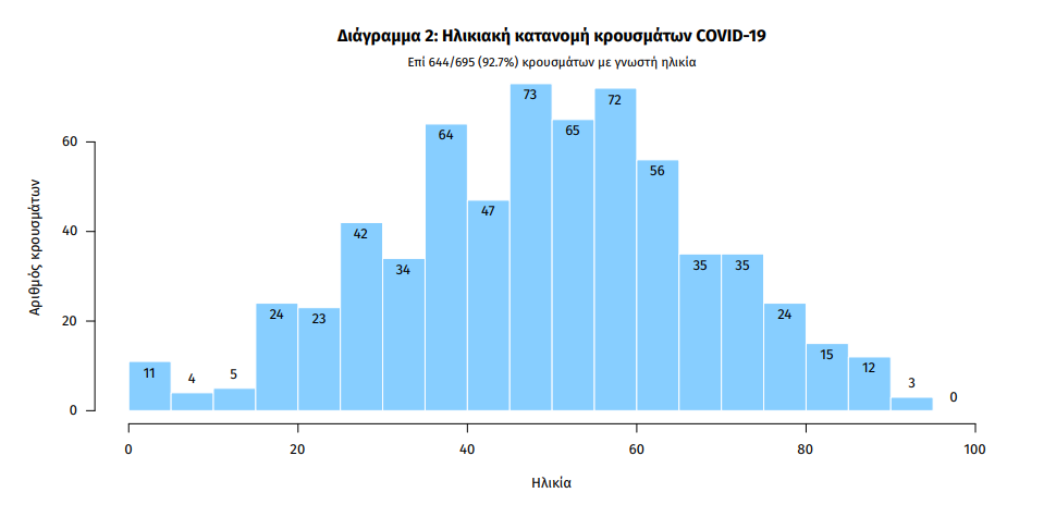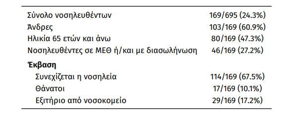 Κρούσματα COVID-19 με νοσηλεία: Έχουν καταγραφεί 169 (24.3%) κρούσματα με νοσηλεία σε νοσοκομείο, εκ των οποίων 46 (27.2%) διασωληνώθηκαν, και 17 (10.1%) έχουν καταλήξει.