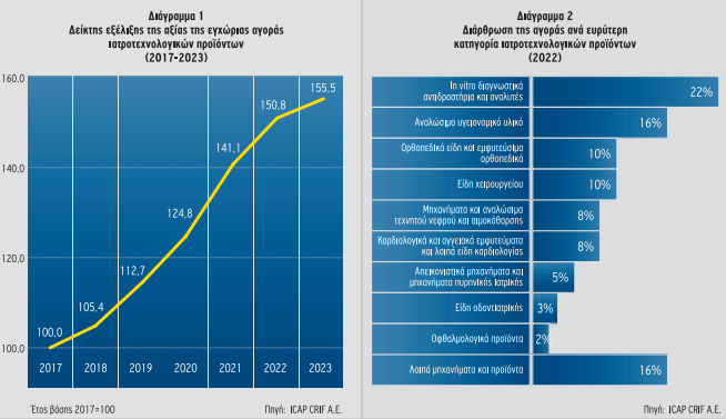 Η αξία της συνολικής εγχώριας αγοράς ιατροτεχνολογικών προϊόντων παρουσιάζει συνεχώς άνοδο από το 2016 και μετά. Ειδικότερα, την τριετία 2021-2023 η αγορά αυξήθηκε μεν, αλλά με μειούμενο ρυθμό. Ο μέσος ετήσιος ρυθμός μεταβολής διαμορφώθηκε περίπου στο 7.5%. Ο δημόσιος τομέας καλύπτει, διαχρονικά, το μεγαλύτερο μέρος των συνολικών πωλήσεων Ιατροτεχνολογικών προϊόντων,  σύμφωνα με την έκδοση “Οι κορυφαίοι κλάδοι στην Ελλάδα 2024” της ICAP CRIF.