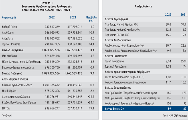 Οι συνολικές πωλήσεις των επιχειρήσεων του δείγματος κατέγραψαν οριακή άνοδο (0,7%) το 2022/2021, τα δε μικτά κέρδη διευρύνθηκαν με ελαφρώς υψηλότερο ρυθμό (2,4%). Σημαντική μείωση κατέγραψαν τόσο τα λειτουργικά αποτελέσματα (-24,5%) όσο και τα καθαρά κέρδη (-24,4%) την ίδια περίοδο, η οποία οφείλεται στη μείωση των λειτουργικών εσόδων σε συνδυασμό με την αύξηση των λειτουργικών εξόδων. Από τις 89 εταιρείες του δείγματος, 84 ήταν κερδοφόρες το 2022 έναντι 86 το προηγούμενο έτος.